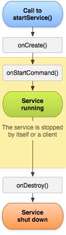 onStartCommand()كان سابقا يسمى في الاصدارات القديمة من أندرويدonStart()وهو حدث يتم عند بدء العملية (العمليات تحدث في المربع الاصفر في الصورة واللذي يحتوي هذا الحدث) - الحدث