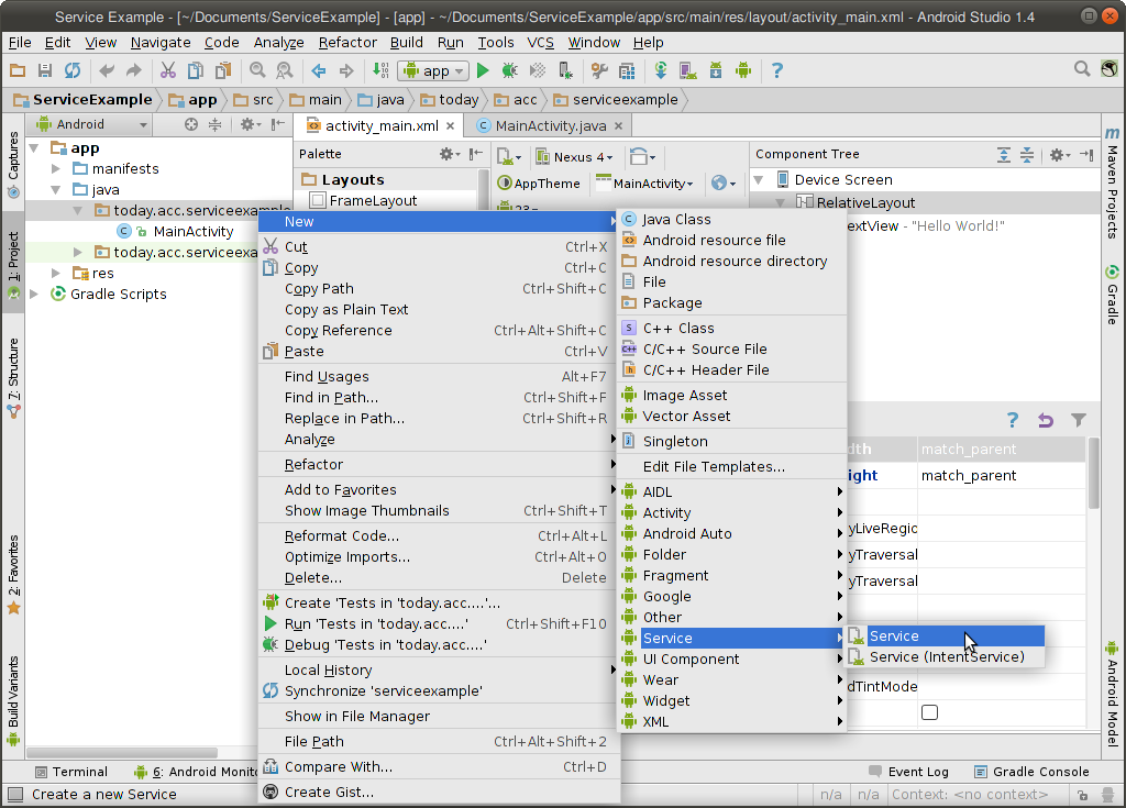 بعد فهم الخدمات غير المقيدة نظريا نأتي الآن الى الجزء العملي ، قم بانشاء مشروع جديد باسم Service Example وقم باضافة كلاس من نوع Service (الصورة التالية ستوضح لك الطريقة) :