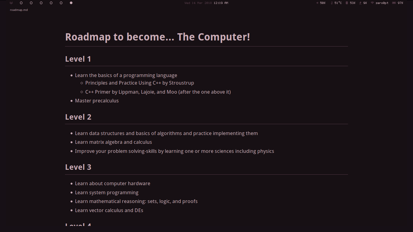 فقدْ شرعْتُ منذُو ما يقاربُ السَّنةَ؛ بالخوضِ في مطالعةِ علومِ الحاسوبِ ، وقراءةُ اﻵراءِ، والتَّجاربِ المتعلقةُ بهَا. فخرجت بخارطة أظنها غطت قدرًا لا يستهانُ بهِ، ولا أنسبْ الفضلَ فيهِ لنفسي بلِّ الفضلُ يعودُ لأصحابهِ الَّذينَ أظهروهُ. وقمتُ بجمعِهَا وتقسيمِهَا على عدَّةِ مستوياتٍ في كلٍّ منهَا عدَّةُ مواضيعٍ بِحُسْبَةِ البابِ فيهَا - ولمْ أبوبْ تحتهَا شيئًا - وأشرْتُ بكلِّ بابٍ بكتابٍ يغطي علمَهُ - راجع قسم الملاحظات -. سأرفقُ الملفَ لاحقًا - مكتوبٌ بلغةِ markdown - ، ليسهلَ عليكَ قراءتهُ على متصفحكَ لاحقا. كمثلِ هذا:
