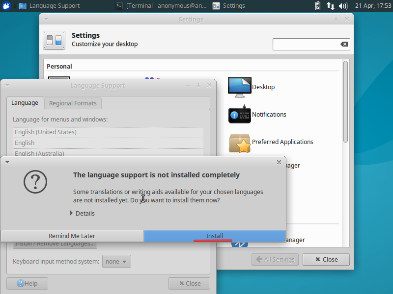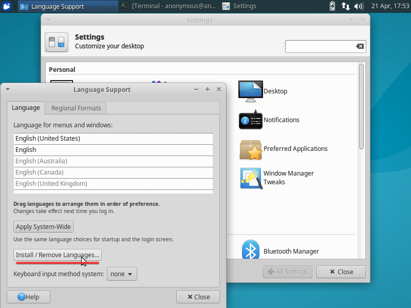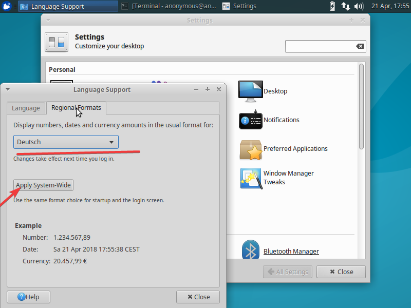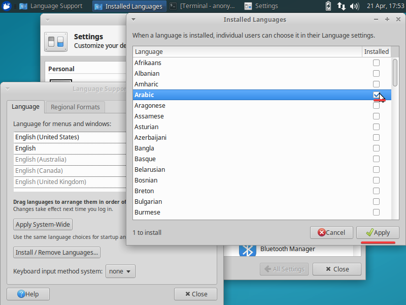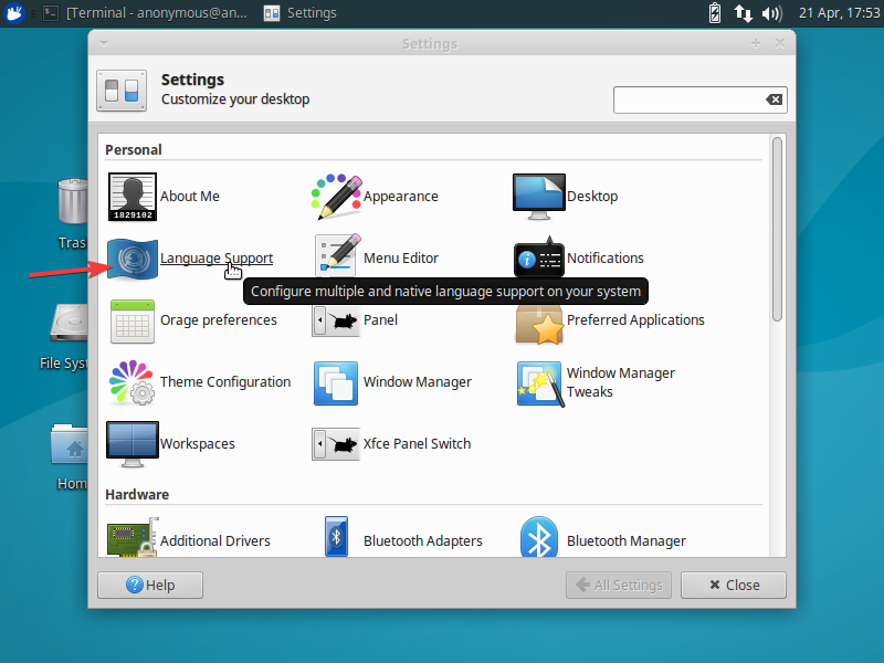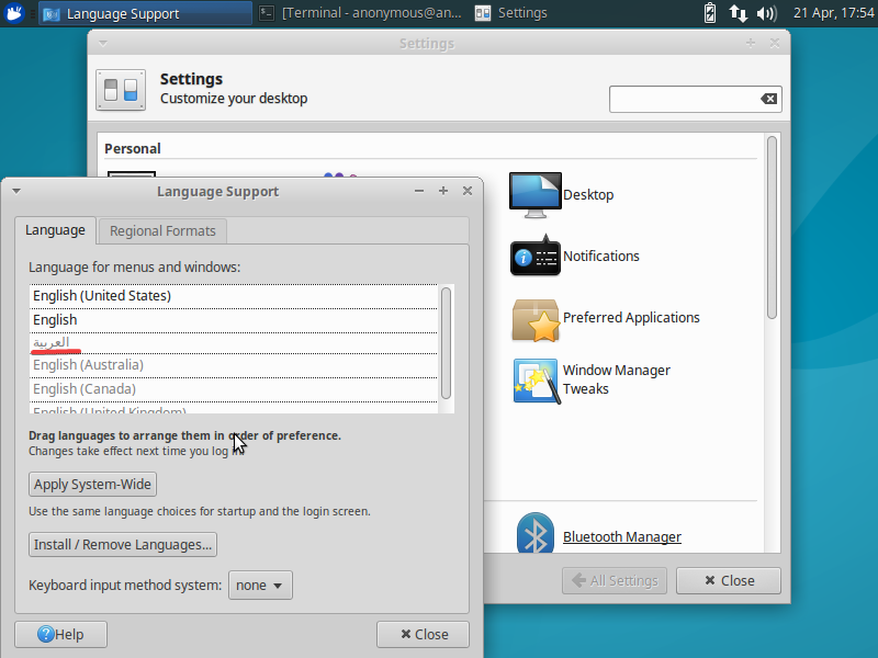 رابعًا: (ضريبة إستعماله) نقوم بجعل جميع إعدادات النظام باللغة العربية، والفكرة تختلف من واجهة لأخرى هنا على Xfce: