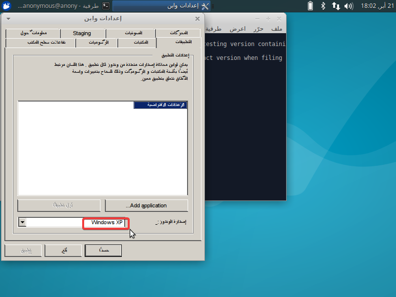 كبداية نقوم بإستعمال Winecfg لجعل النظام Windows XP (أراه الافضل بما أن التطبيق قديم ومنتهي الدعم منه):
