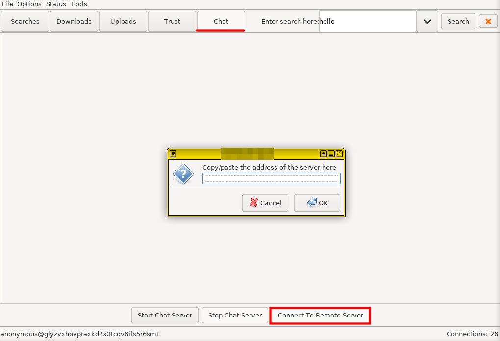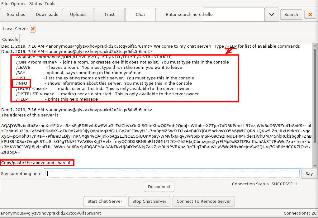 - او عن طريق ان تفتح انت السيرفر وتعطيه العنوان بالضغط على Start Chat Server وبعدها تكتب /help ستظهر لك قائمه المساعده ونكتب بعدها /info وسيظهر لك عنوان الغرفه الخاصه بك وتقوم بنسخه واعطائه لمن تريد مثلما موضح بالصوره