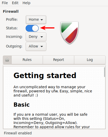 بعد التنصيب يكون ufw غير مفعل بشكل تلقائي وذلك بسبب اذا قام احدهم بتنصيبه على سيرفر خارجي ويكون مفعل بشكل تلقائي وهذا يعني قطع جميع اتصالات الIncoming (وهو الخيار المفعل تلقائيا مع UFW) فسيقطع اتصال الSSH,VNC..الخ وهنالك بعض الاستثناءات لذلك يمكن الاطلاع عليها في الملفات etc/ufw/ او: