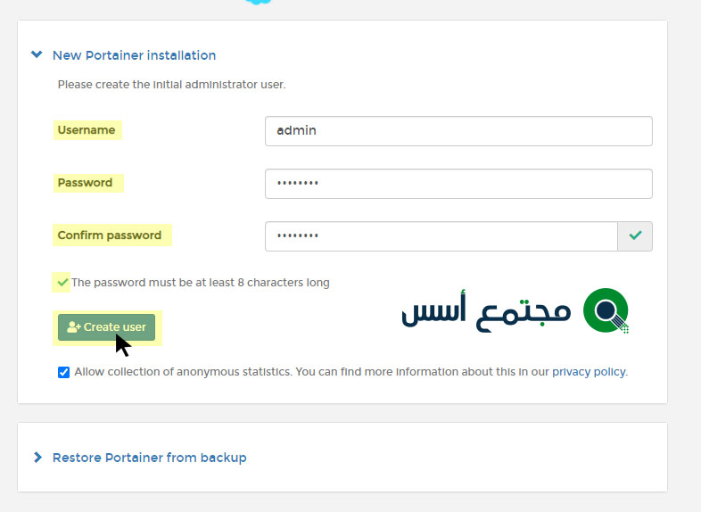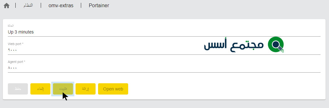 بعد انتهاء التثبيت نقوم بالضغط على Open web او الدخول عن الطريق البورت 9000