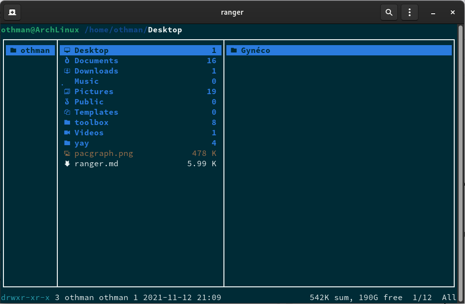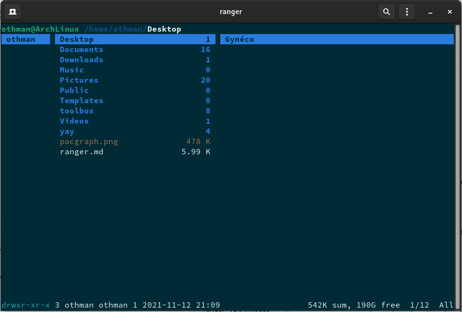اختصارات مفاتيح Ranger مستوحاة من محرر النصوص Vim؛ للتنقل لأعلى ولأسفل في قائمة الدلائل والملفات ، على سبيل المثال، يمكنك استخدام مفاتيح الأسهم أو h j k lللتنقل، وزر Enter لفتح الملف، وزر q للخروج من التطبيق.