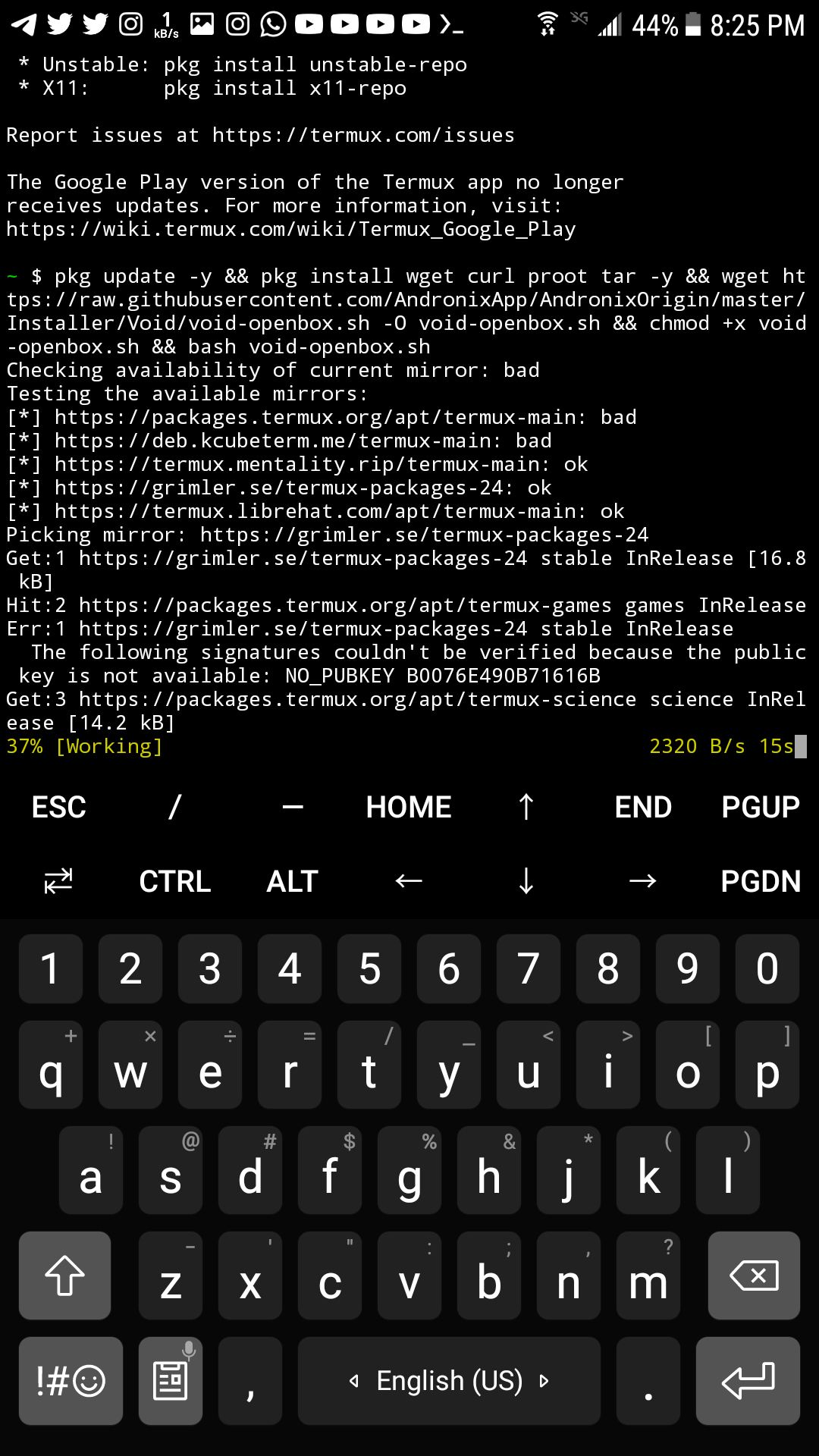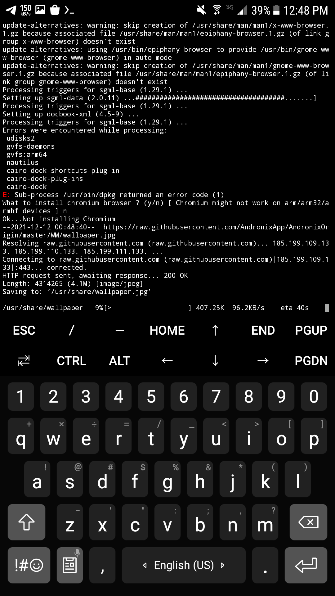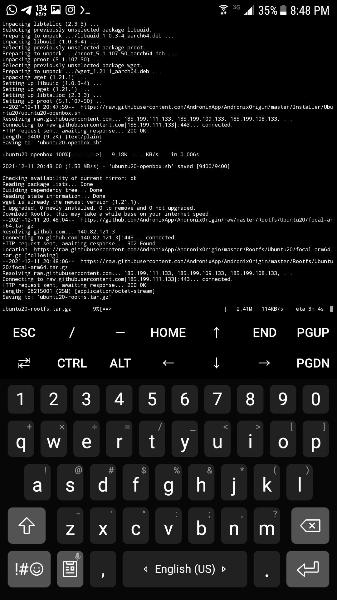 بعد ذلك قم بالضفط مع الاستمرار في اي مكان في الطرفيه و قم بلصق الامر الذي تم نسخه من andronix وقم بضغط inter ، بعدها احضر كأس من الماء لا تتوقع من ان اخبرك أن تحظر قهوه او شاي او ما شابه فانا اكره المنبهات لا تتوقع مني اي شيئ بهذا الموضوع هههههههه ، و انتظر ريثما يقوم بالتحميل و التثبيت :
