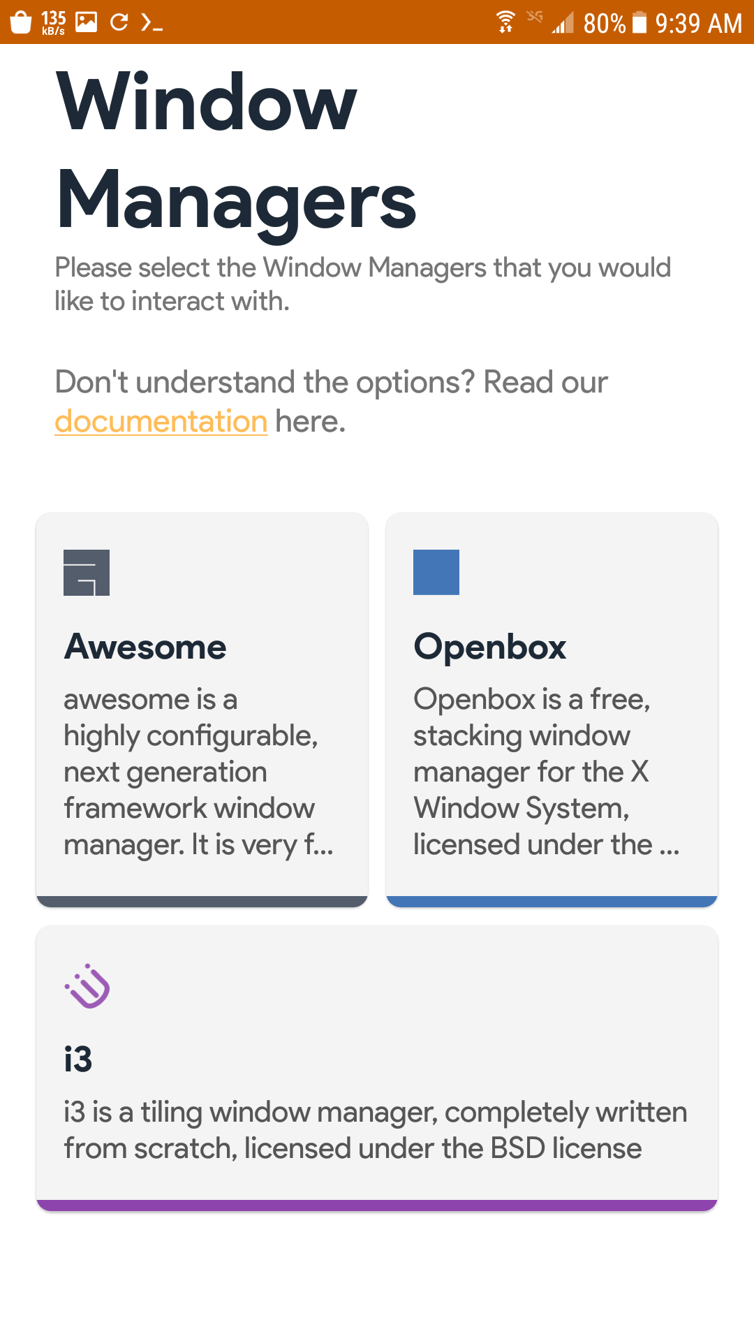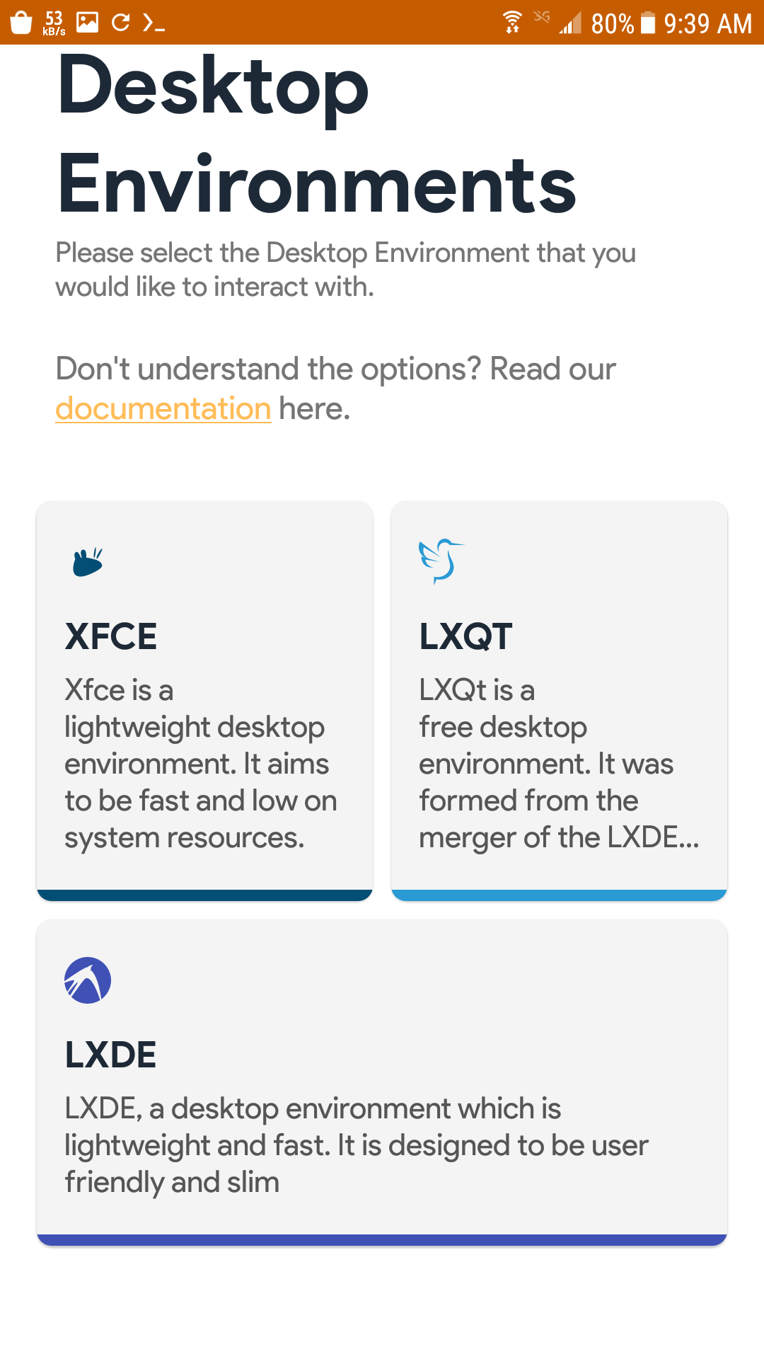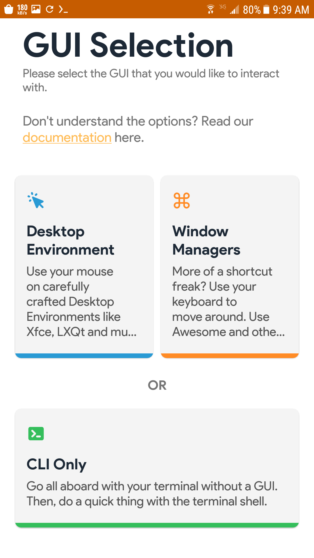 انا سوف اختار مدير النوافذ openbox لان حجمه بسيط و يعمل كالواجهه ، افضل لك اذا لم تستخدم اي مدير نواف من قبل أن تقوم بإختيار واجهه رسوميه و في هذه الحاله ارشح xfce اذا كان هاتفك بمواصفات جيده ، اما اذا كان بمواصفات اقتصاديه فعليك بواجهة lxqt , كما قلت انا سوف اختار openbox بعد اختيارك للواجهة اضغط على ايقونتها ، سوف ينتقل بك الى نافذه اخرى وهي كالاتي: