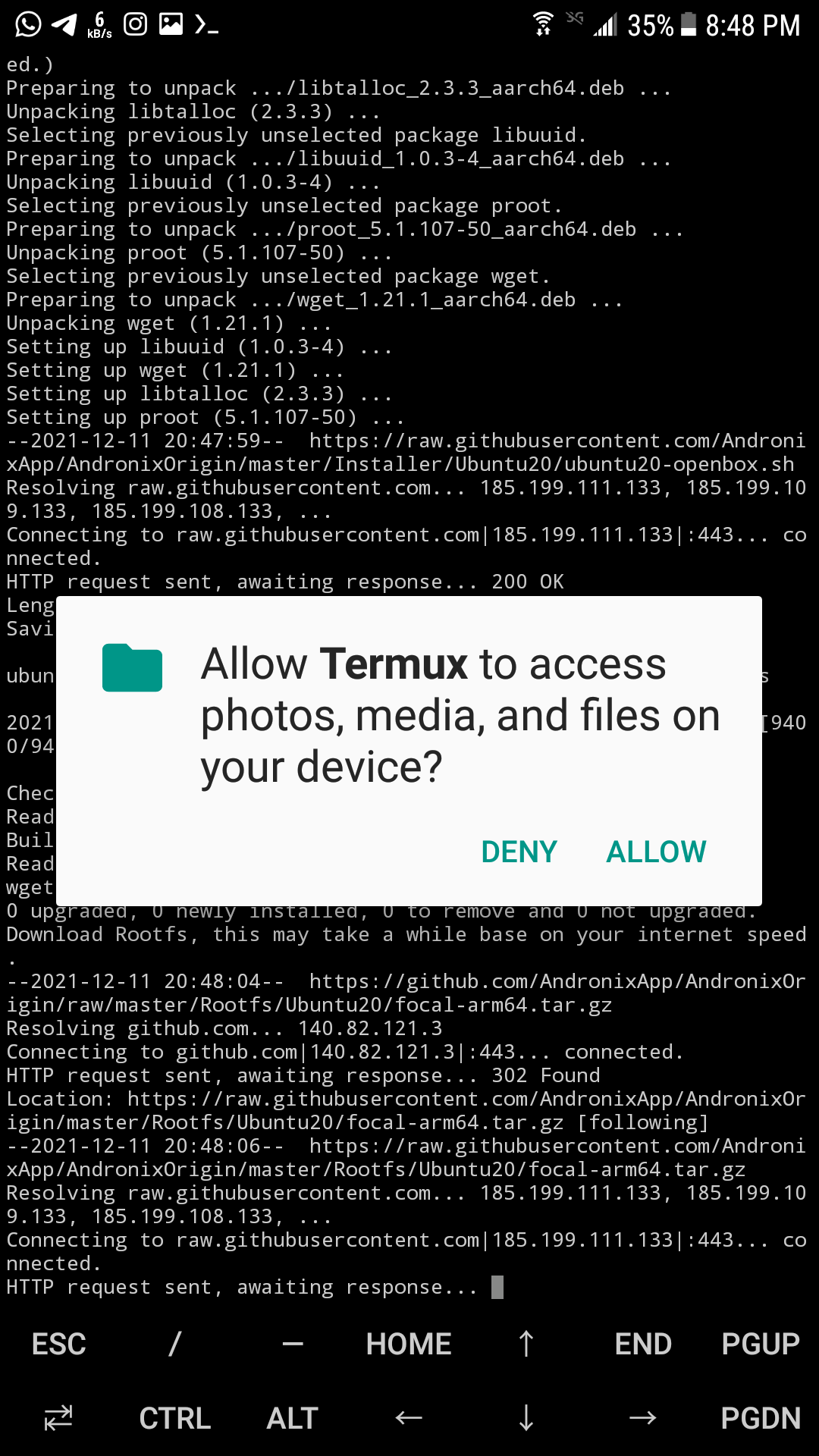 بعد ذلك سوف يطلب أذنك في الوصول الى ذاكر الجهاز قم بإعطائه الأذن لذلك ، بعده سوف يبدا بتحميل ملف التوزيعه حجمه حوالي 22ميجا :