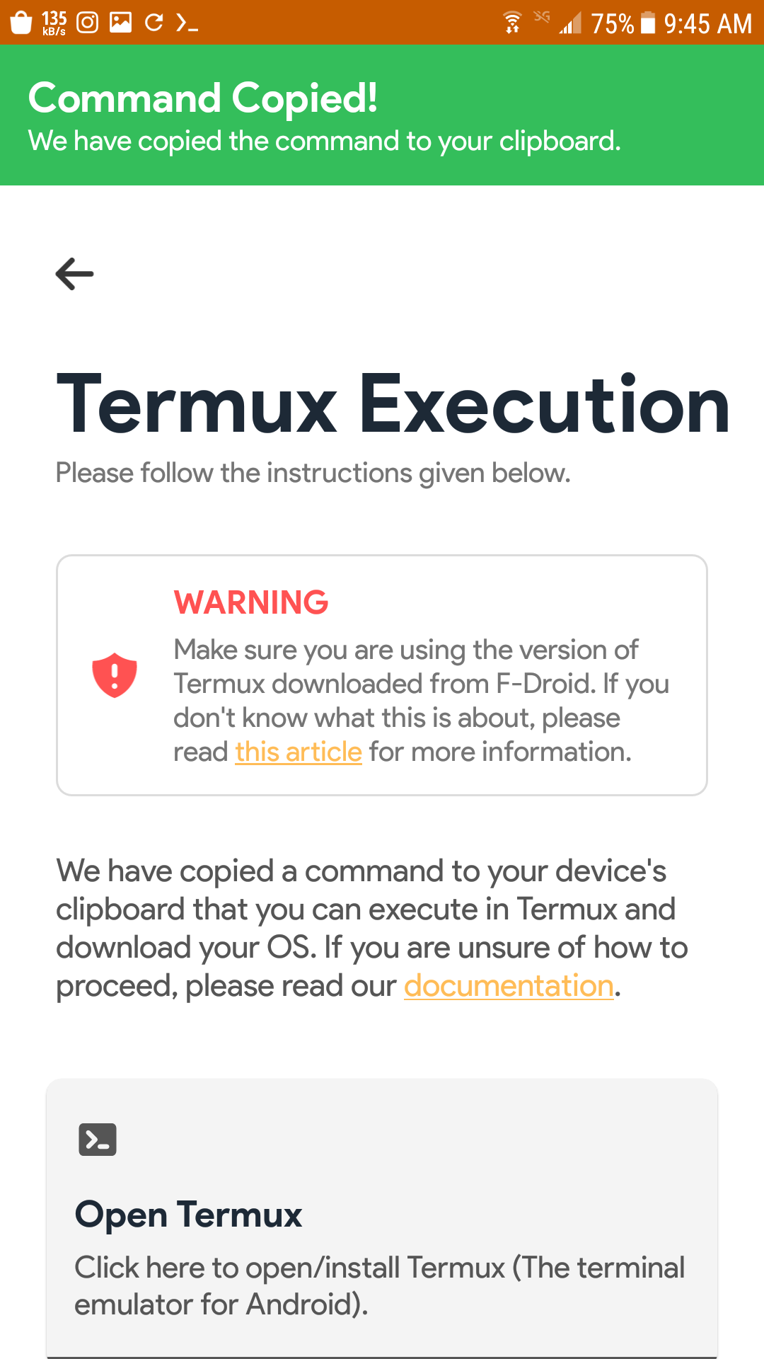بعد دالك سوف يقوم بنسخ امر طرفيه الى الحافظة الخاصه بجهازك كل ما عليك فعله هو الضغط على open termux لنقلك الى طرفيه Termux قبل لصق الامر الذي تم نسخه قم بتنفيذ الامر التالي :