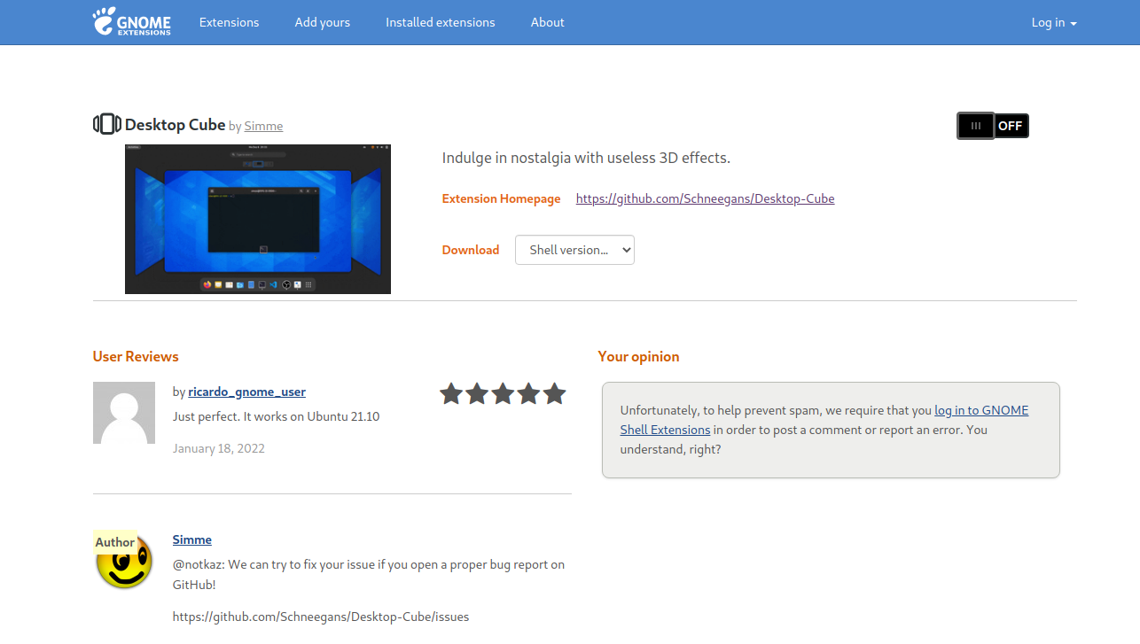 وبهذا إنتهت عملية ربط متجر جنوم بالنظام ويمكنك تثبيت الإضافات بكل سهولة، حيث هناك زر جديد لتحميل الإضافات، وعلى ذلك النهج نعود إلى إضافتنا الرائعة “Desktop Cube” ونضغط على “ON” ثم “install”.