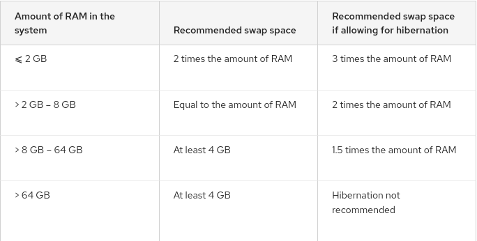 قسم الاستبدال Swap: ويكون حجمه على حسب حجم الذاكرة العشوائية (الرام) وحسب استخدام خاصية إسبات النظام من عدمه وهذه قائمة اقتراحات من فريق ريدهات: