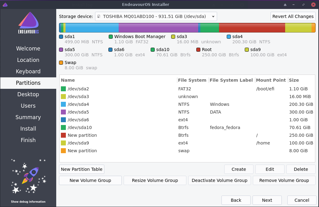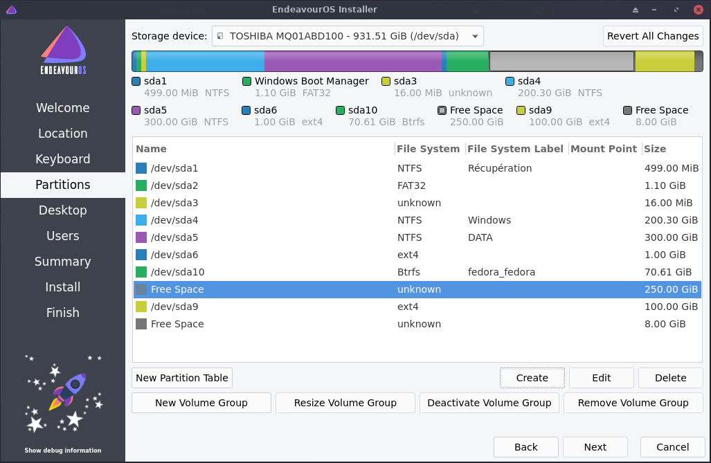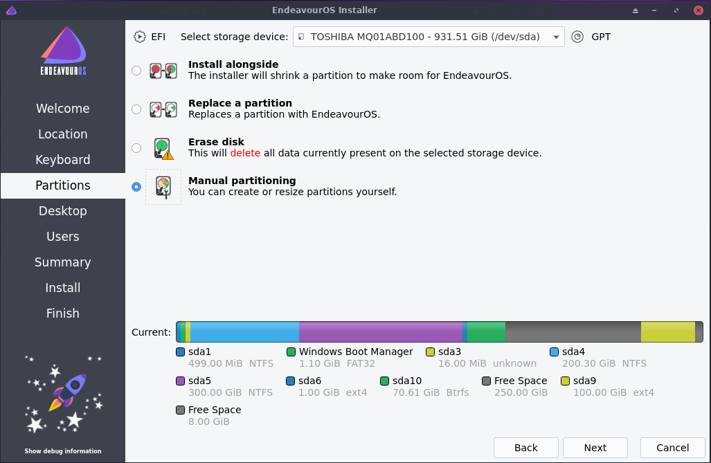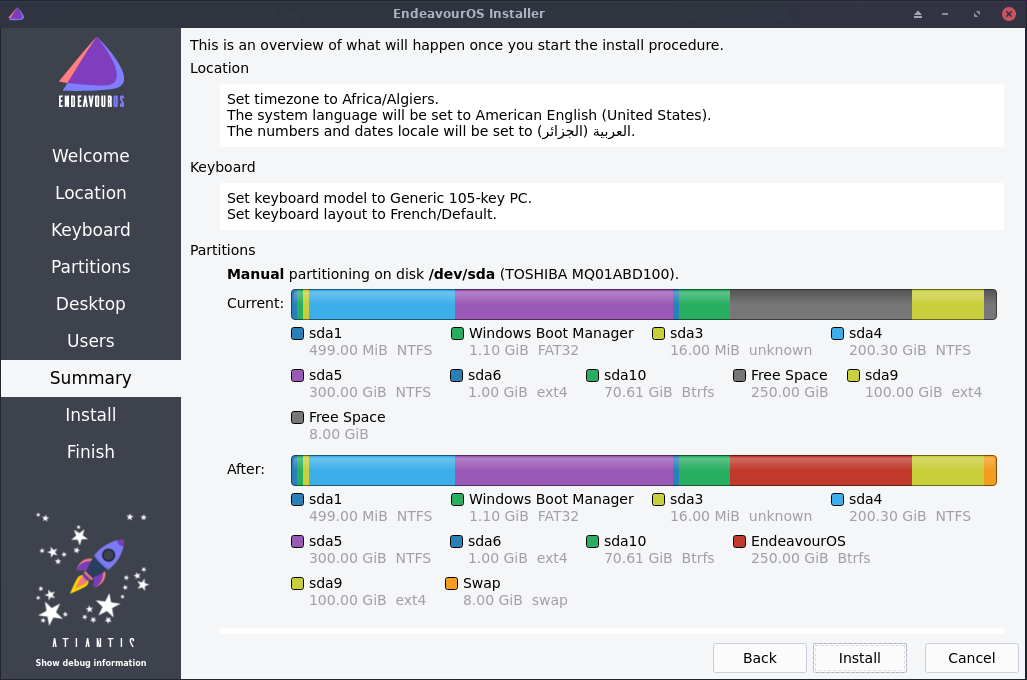 ملاحظة 2: في المقال السابق قمت بتثبيت توزيعة منجارو أما هذه المرة فقمت باستبدالها بتوزيعة Endeavour os لذلك قمت بتهيئة قسم الجذر (المساحة الفارغة أعلى قسم dev/sda9) وقسم الاستبدال Swap (المساحة الفارغة أسفل قسم dev/sda9) باستعمال Gparted وتركت قسم المنزل كما هو (/dev/sda9) دون تهيئة وذلك ﻷني أردت الحفاظ على ملفاتي وإعدادات البرامج كما هي وهذا من فوائد فصل قسم الجذر عن المنزل.