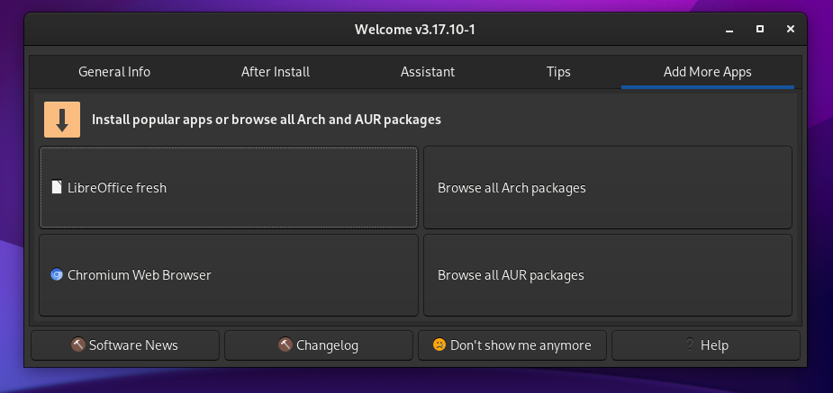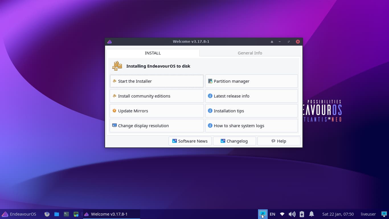 • شاشة الترحيب: يأتي EndeavourOS مع تطبيق ترحيب غني بالميزات متاح قبل التثبيت وبعده ، حيث يعمل كمساعد لإرشادك خلال رحلتك في استخدام التوزيعة وذلك لمساعدة المستخدمين الجدد.