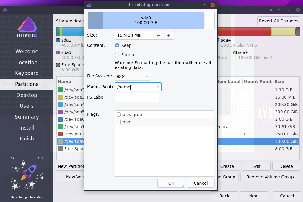 نحدد قسم /dev/sda9 ونضغط على Edit وعند Content نحدد خيار Keep حتى لا نحذف الملفات ثم من Mount point نختار home/، ثم نضغط OK.