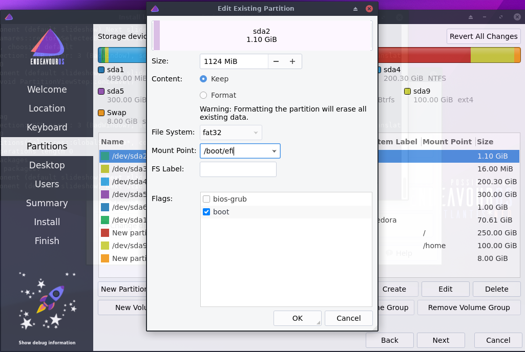 ملاحظة: نضغط على قسم EFI ثم نضغط على Edit وعند Content نحدد خيار Keep حتى لا نحذف ملفات الإقلاع الخاصة بالأنظمة الأخرى ثم من Mount point نختار /boot/efi ثم نضغط OK.