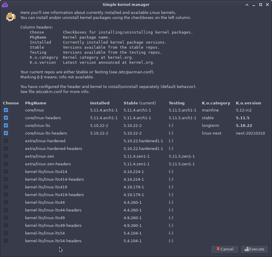 مدير النواة هو أداة بسيطة طورها فريق EndeavourOS للسماح للمستخدمين بالتبديل بين مختلف إصدارات النواة. يمكنك فقط تحديد النواة التي تريدها وسيتم تثبيتها على الفور.