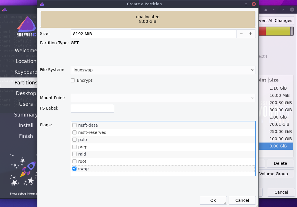 قسم EFI: قسم بنظام ملفات FAT32 و بحجم 1 جيجابايت، يستخدم هذا القسم في الإقلاع على الأجهزة التي تدعم الإقلاع من نوع UEFI. إن كان هذا القسم موجودا (كما هو الحال عند وجود ويندوز على الجهاز غالبا) فلا تحتاج إلى إنشائه.