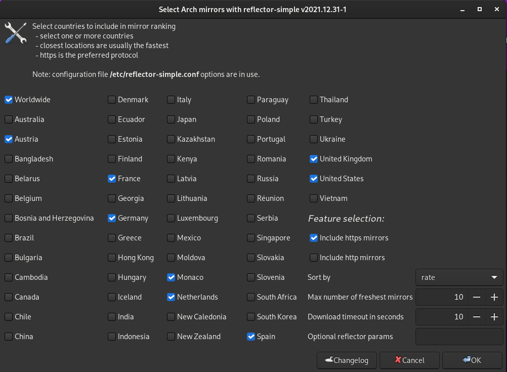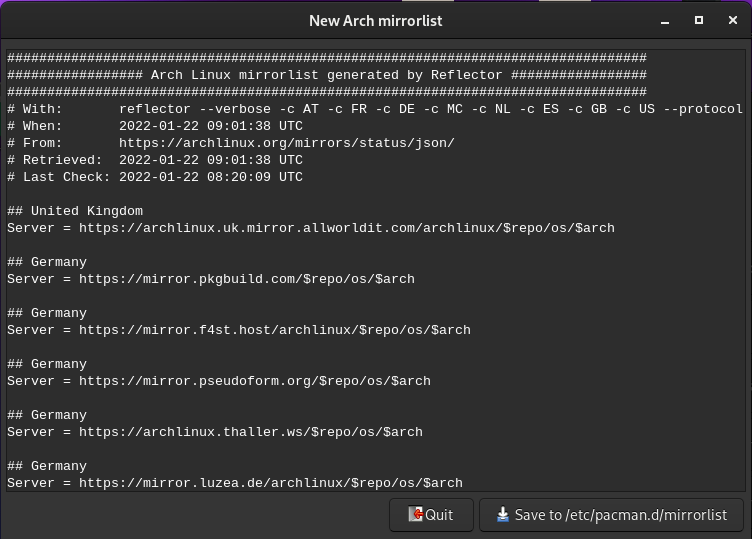 أحد البرامج المفيدة حقا والتي هي من تطوير فريق التوزيعة هي أدة “Reflactor Simple” حيث تسمح لك باختيار أسرع المرايا على حسب توزيعها في مختلف دول العالم كما يمكنك اختيار بروتوكول الإتصال https ثم حفظها في ملف /etc/pacman.d/mirrorlist