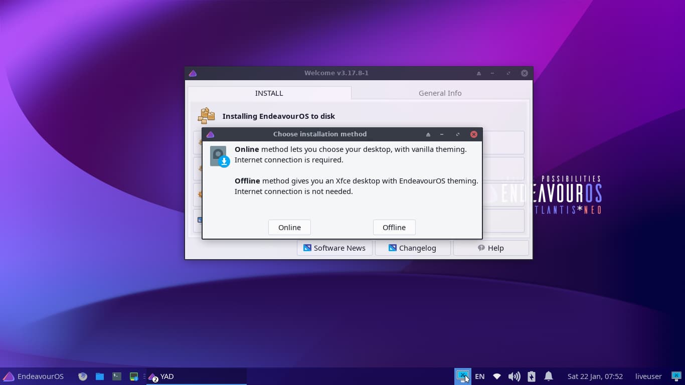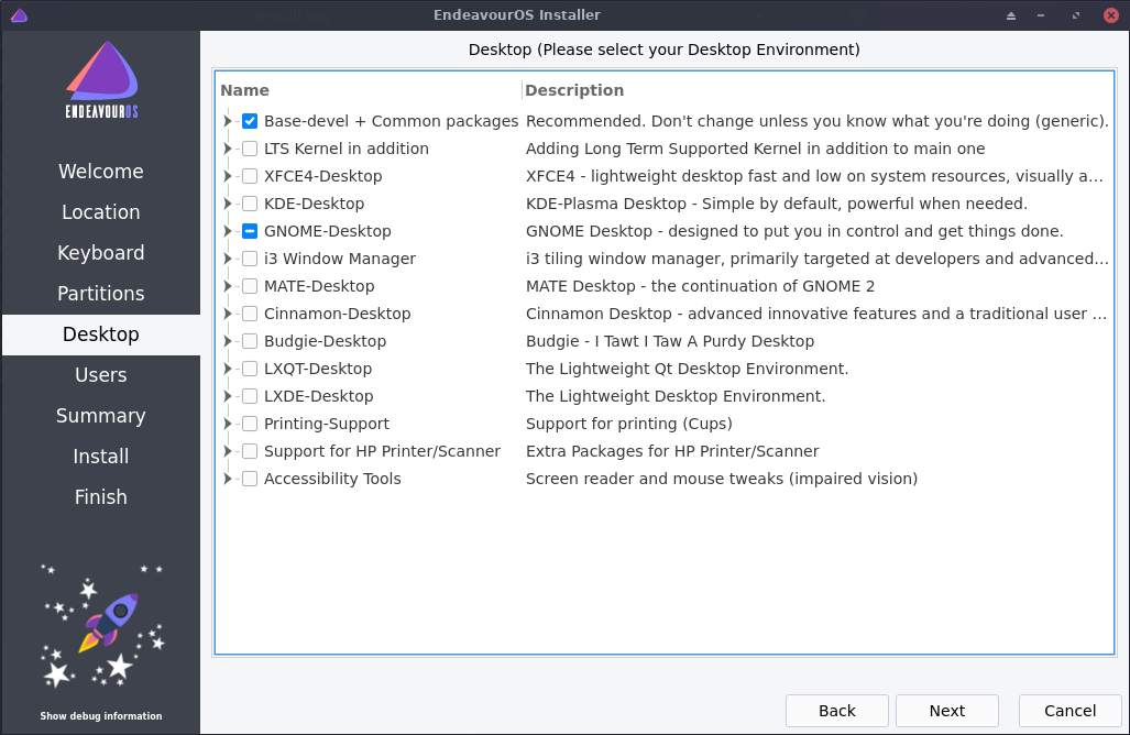 تأتي النسخة الحية من توزيعة Endeavour os بواجهة xfce مخصصة افتراضيا، لكن يمكنك الاختيار بين العديد من الواجهات ومدراء النوافذ أثناء التثبيت.