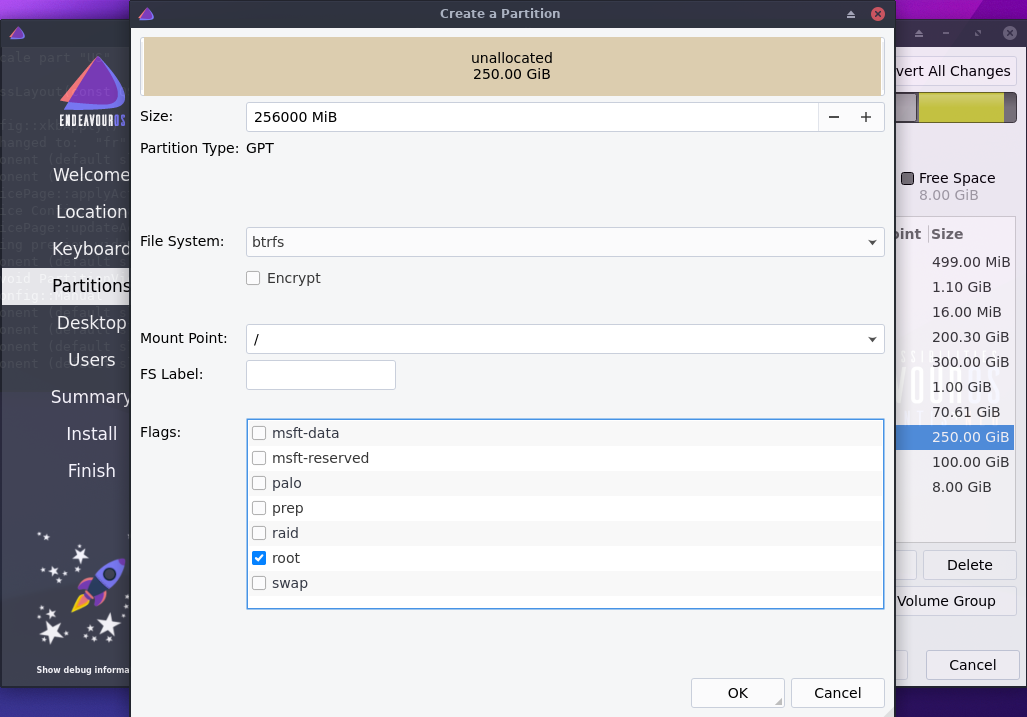 نقوم بإنشاء قسم EFI. إن كان هذا القسم موجودا كما هو الحال في جهازي فلا تحتاج إلى إنشائه لذلك ننتقل الخطوة الثانية وهي إنشاء قسم الجذر، من Size نحدد حجم القسم بالنسبة لي اخترت 250 جيغا، ثم نختار نظام الملفات Btrfs من أجل عمل لقطات للنظام أثناء التحديث، ثم من Mount point نختار علامة / ثم نضغط OK.