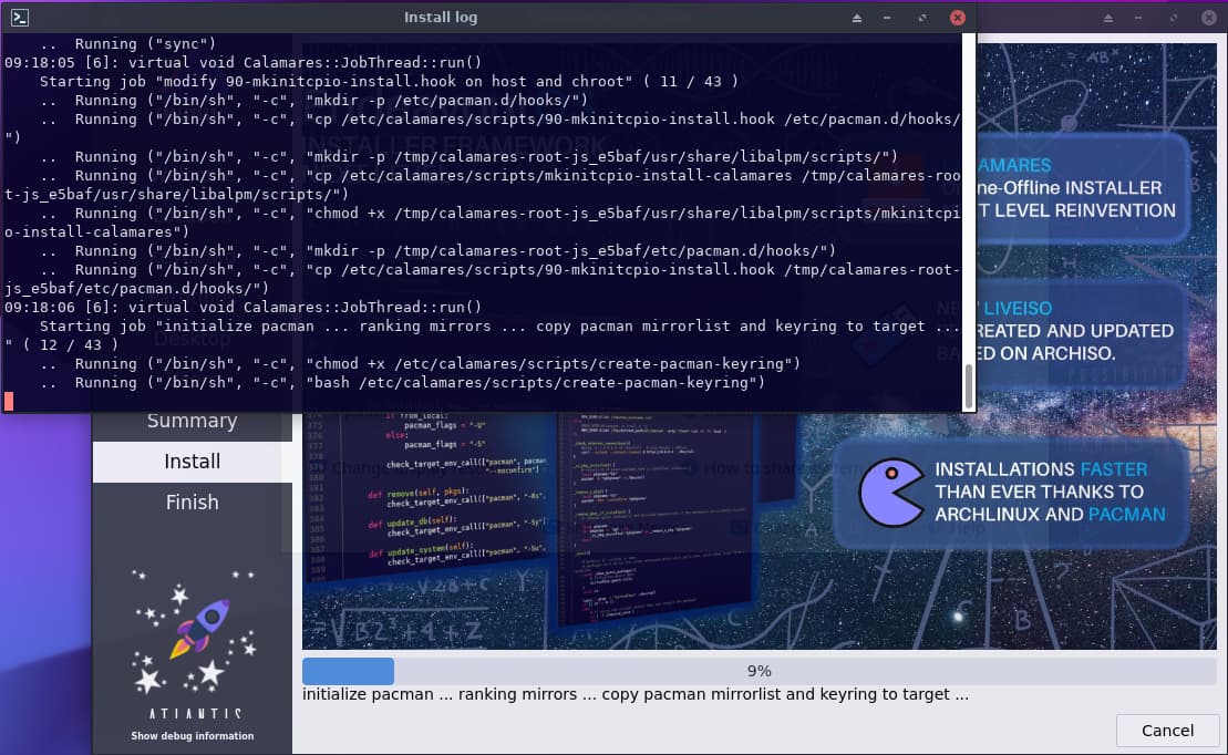 يقوم المثبت بفتح الطرفية تلقائيًا لإظهار مخرجات التثبيت جنبا إلى جنب مع مثبت calamares حيث يمكنك أن ترى بالضبط ما يحدث.