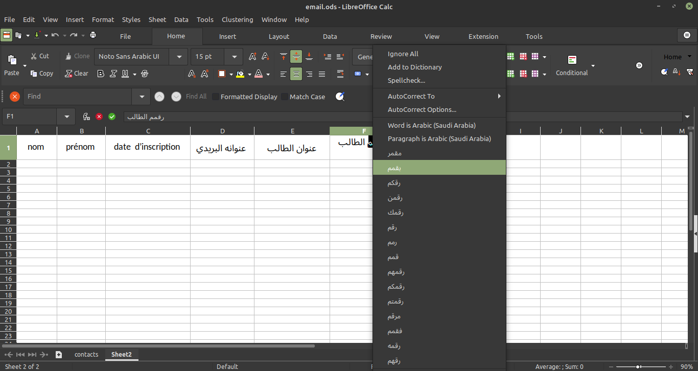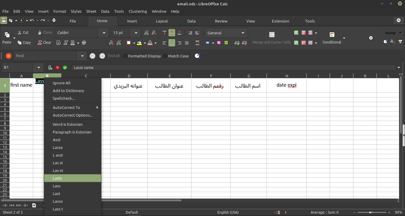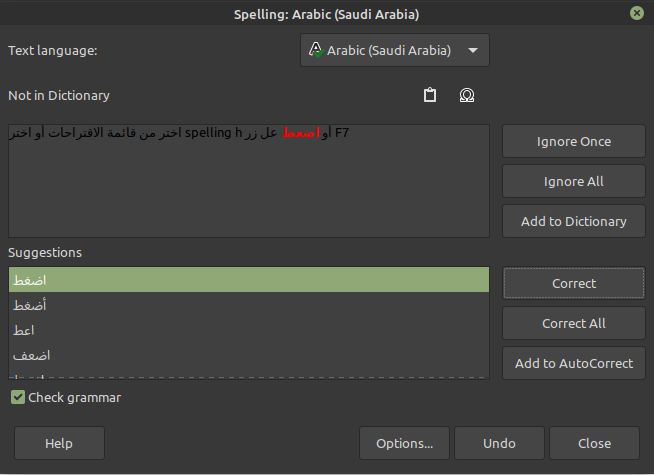 - اختر من قائمة الاقتراحات أو اختر spelling