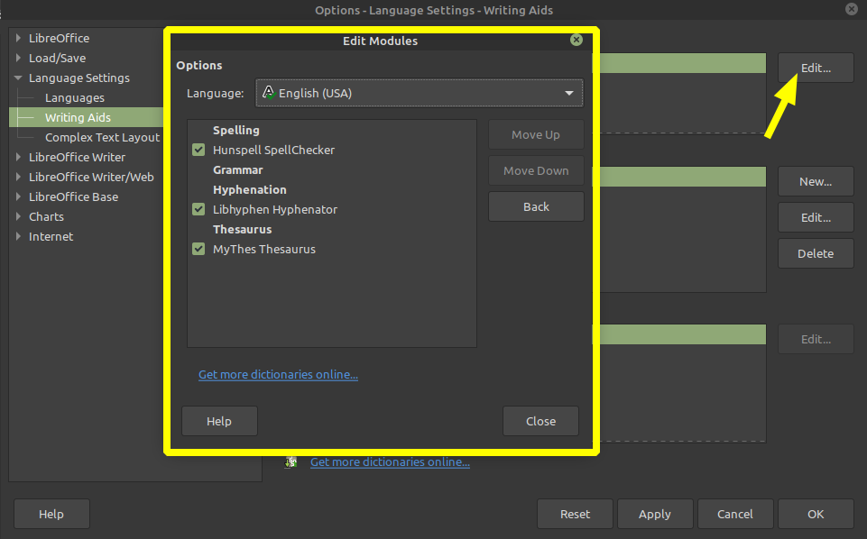 - يمكنك أيضا إعداد القواميس الأخرى من خلال الضغط على الزر Edit