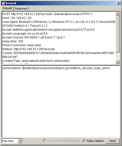 يؤدي تحديد هذا الخيار إلى ظهور مربع جديد يلخص جميع البيانات التي سيتم إرسالها في إرسال النموذج. الشيء الجميل في هذه البيانات الموجزة هو أنه يمكن التلاعب بها قبل إرسالها. للمتعة فقط ، دعنا نحاول إدخال بعض علامات الاقتباس الفردية وتعليقات SQL لمعرفة ما إذا كان بإمكاننا تنفيذ هجوم حقن SQL. سنقوم بتغيير POST URl من POST ‘http://192.168.42.128/؟q=node&destination=node’ إلى 'POST http://192.168.42.128/؟q=node’--&destination=node’ والقيمة لحقل “الاسم” للنموذج من “المسؤول” إلى “المسؤول” - المستكشف ومعرفة ما سيحدث. انطلق وقم بتغيير هذه القيم ثم انقر فوق الزر “إرسال” في الزاوية اليسرى السفلية من هذه النافذة: