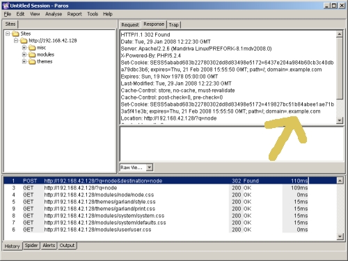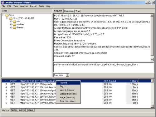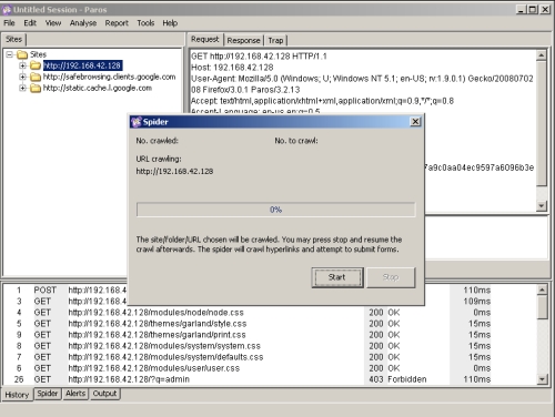 سيوضح الجزء المتبقي من هذا البرنامج التعليمي استخدام Paros لفحص وتغيير حركة المرور من وإلى موقع Drupal الذي تم إعداده على جهاز افتراضي. دروبال هو نظام رائع لإدارة المحتوى مكتوب بلغة PHP مع نهاية خلفية لقاعدة بيانات MySQL. باستخدام باروس ، يمكننا النظر إلى بعض حركة مرور HTTP المتضمنة في التفاعل مع موقع دروبال ، واختبار بعض التحقق من صحة إدخال البيانات ، وحتى إجراء بعض التصحيح.
