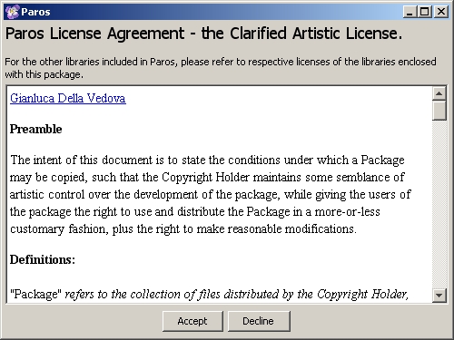 على ويندوز بمجرد التثبيت ، يجب أن تجد Paros ضمن Start → Programs → Paros. في المرة الأولى التي تبدأ فيها باروس ، سيُطلب منك قبول اتفاقية الترخيص مرة أخرى اضغط على قبول Accept