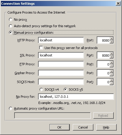 (127.0.0.1) وعلى المنفذ 8080. نحن نطبق هذه الإعدادات لـ HTTP و SSL و FTP و Socks v5.