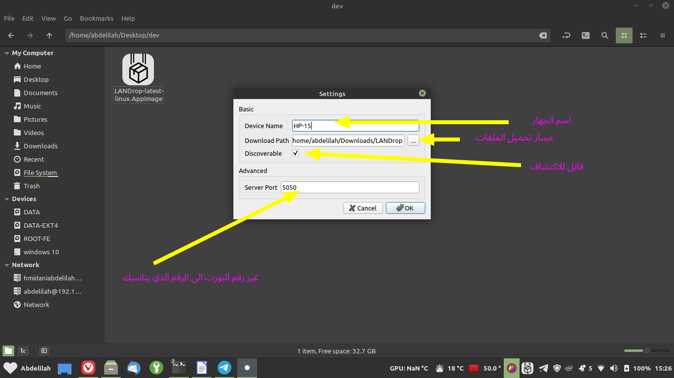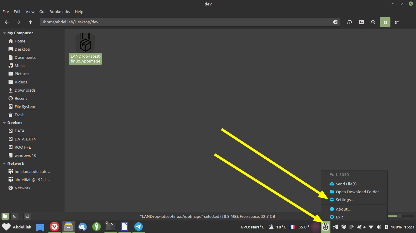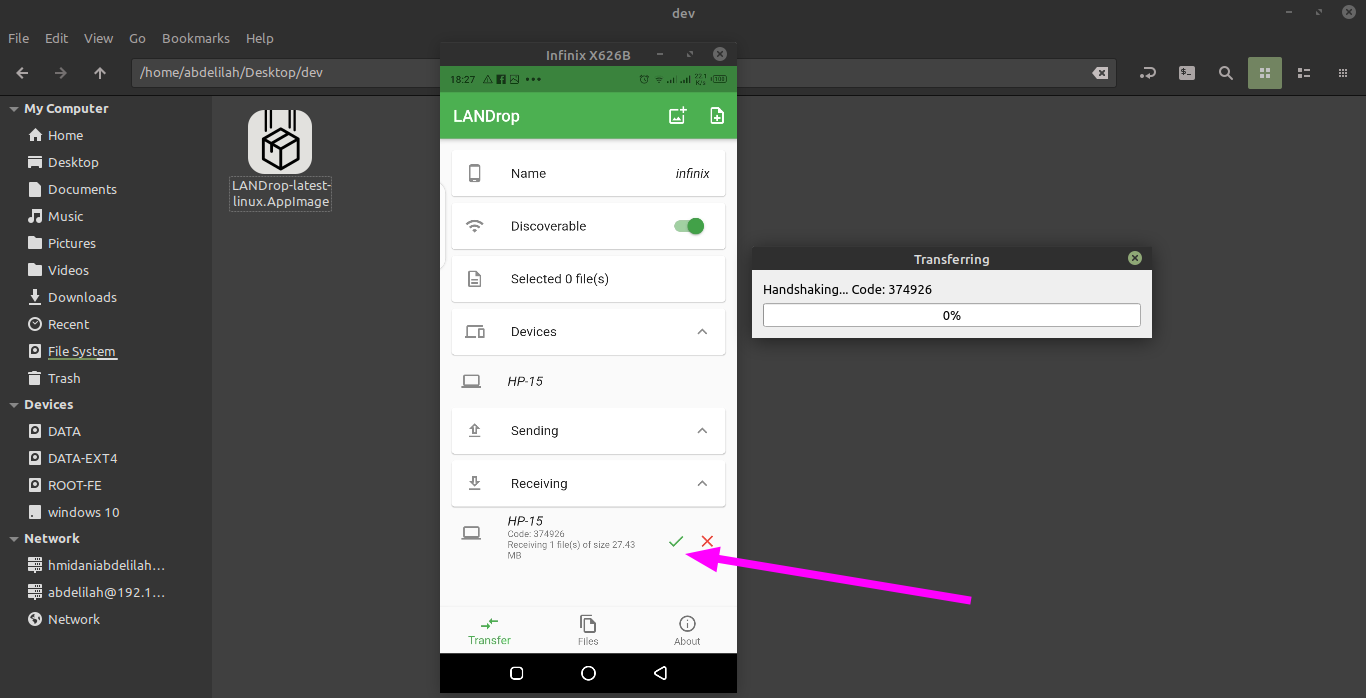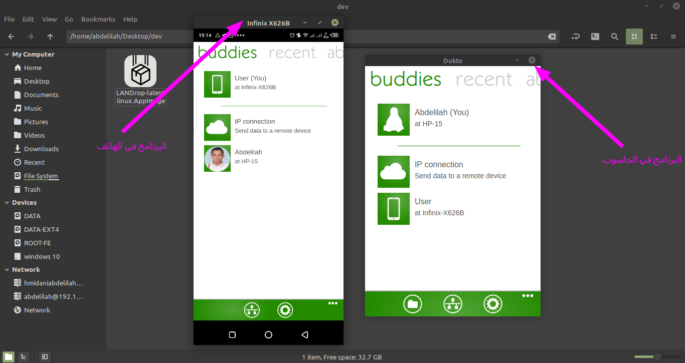 لتحميل البرنامج AppImage من الرابط التالي: https://releases.landrop.app/LANDrop-latest-linux.AppImage