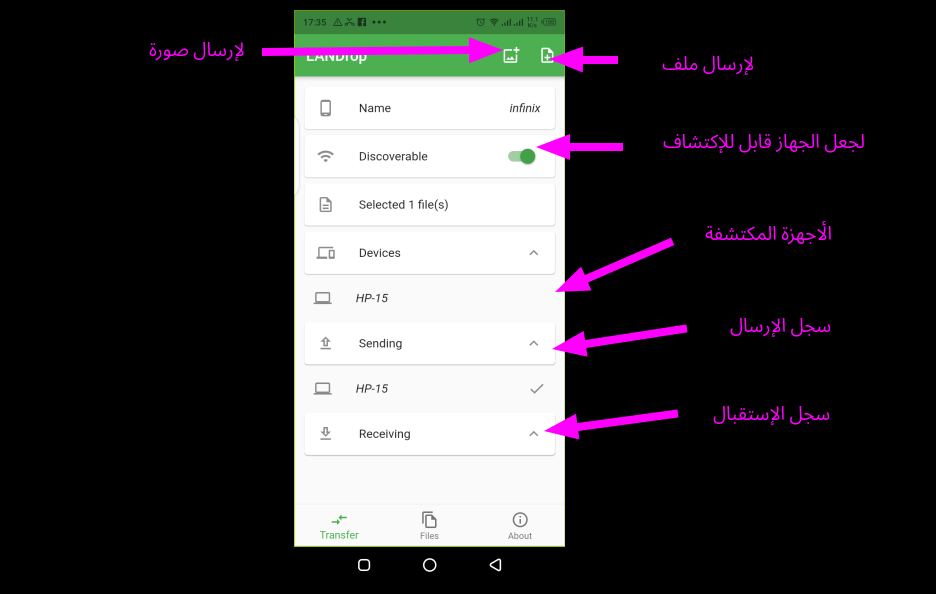 يجب أن يكون التطبيق مفتوح في الجهاز المستقبل طيلة عملية الإرسال