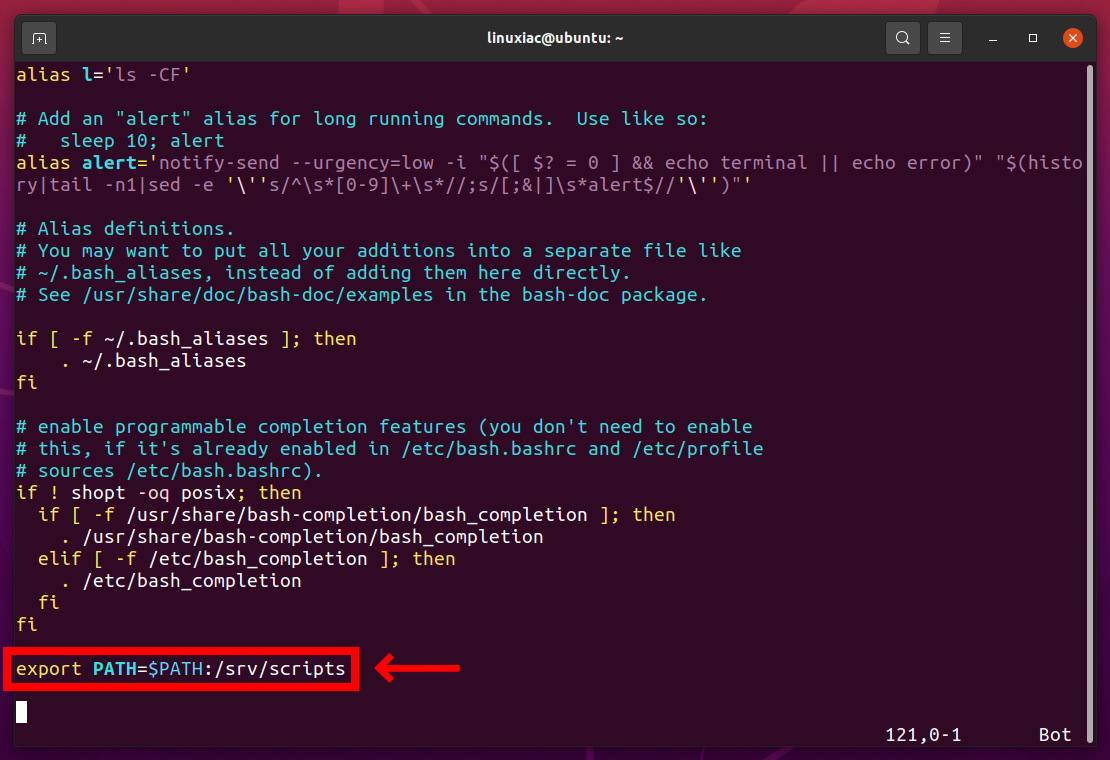ذالك يتم بإضافة مسار ثابت الى PATH الى .bashrc نفتح الملف بمحرر نانو