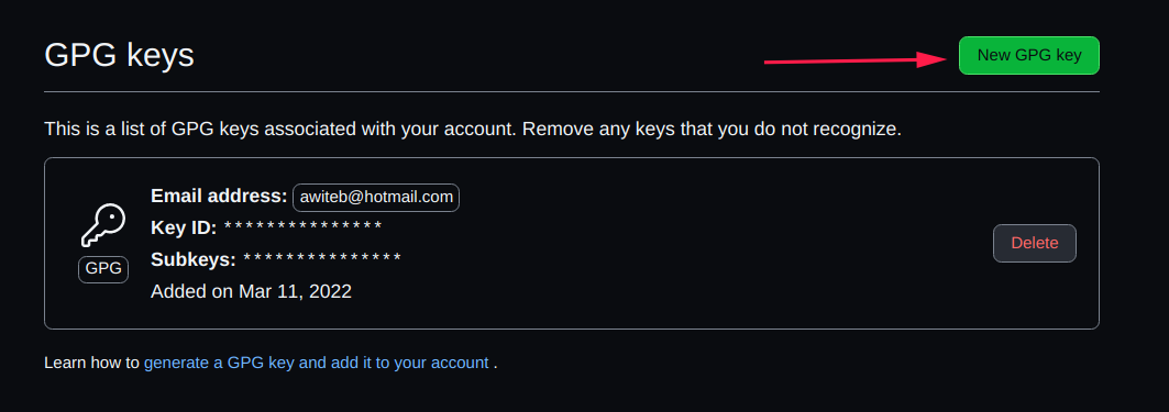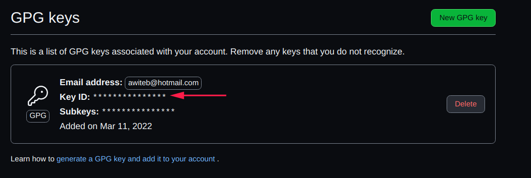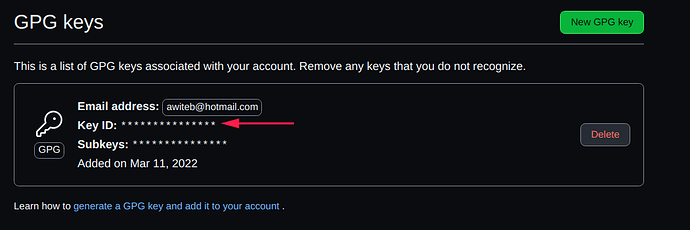 تنويه: لاتقوم بمسح مفاتيح ال GPG الخاصة بك على GitHub لانه سوف يتم ازالة علامات التوثيق ( verified ) بعلامة عدم التحقق ( Unverified ) من العمليات التي تم توثيقها عبرها