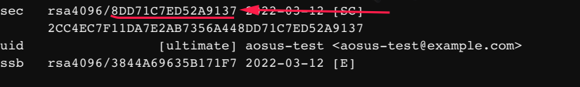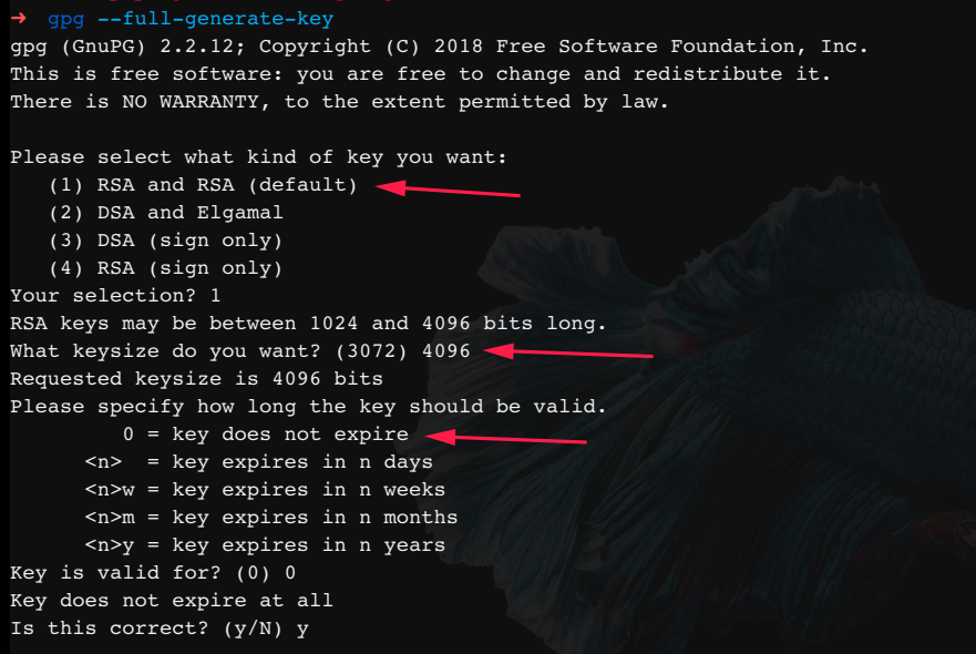 اذا وجدت مفتاح قم بنسخ ال Key ID ( لاتخبر احد به ) وذهب الى الخطوة التالية، اذ لم تجد مفتاح هيا لننشئ مفتاح سوياً، اولا نفتح الطرفية ( Terminal ) ونقوم بكتابة هذه الامر gpg --full-generate-key بعدها سوف نحتار النوع اختار RSA and RSA وبعدها سوف يسالك عن طول المفتاح يفضل اختيار 4096 وبعدها سوف يطلب منك وقت انتهاء المفتاح يفضل عدم وضع تاريخ انتهاء لعدم زوال علامة التوثيق