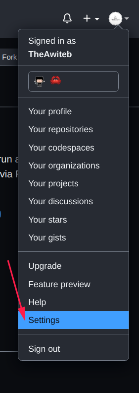 الان سوف نتاكد من وجود مفتاح GPG في GitHub لتفادي انشاء مفتاح جديد، في البداية يجب عليك الدخول الى GitHub وتسجيل الدخول، بعد تسجيل الدخول توجه الى الاعدادات ( settings )