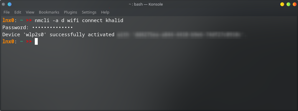 nmcli -a d wifi connect khalid