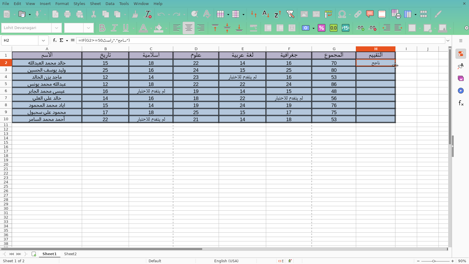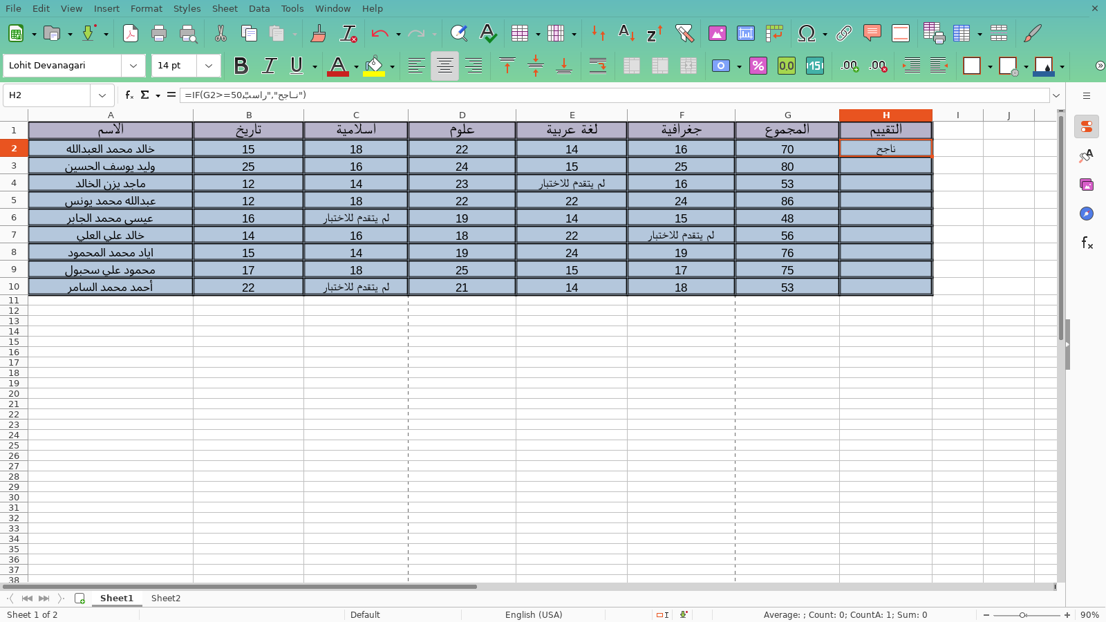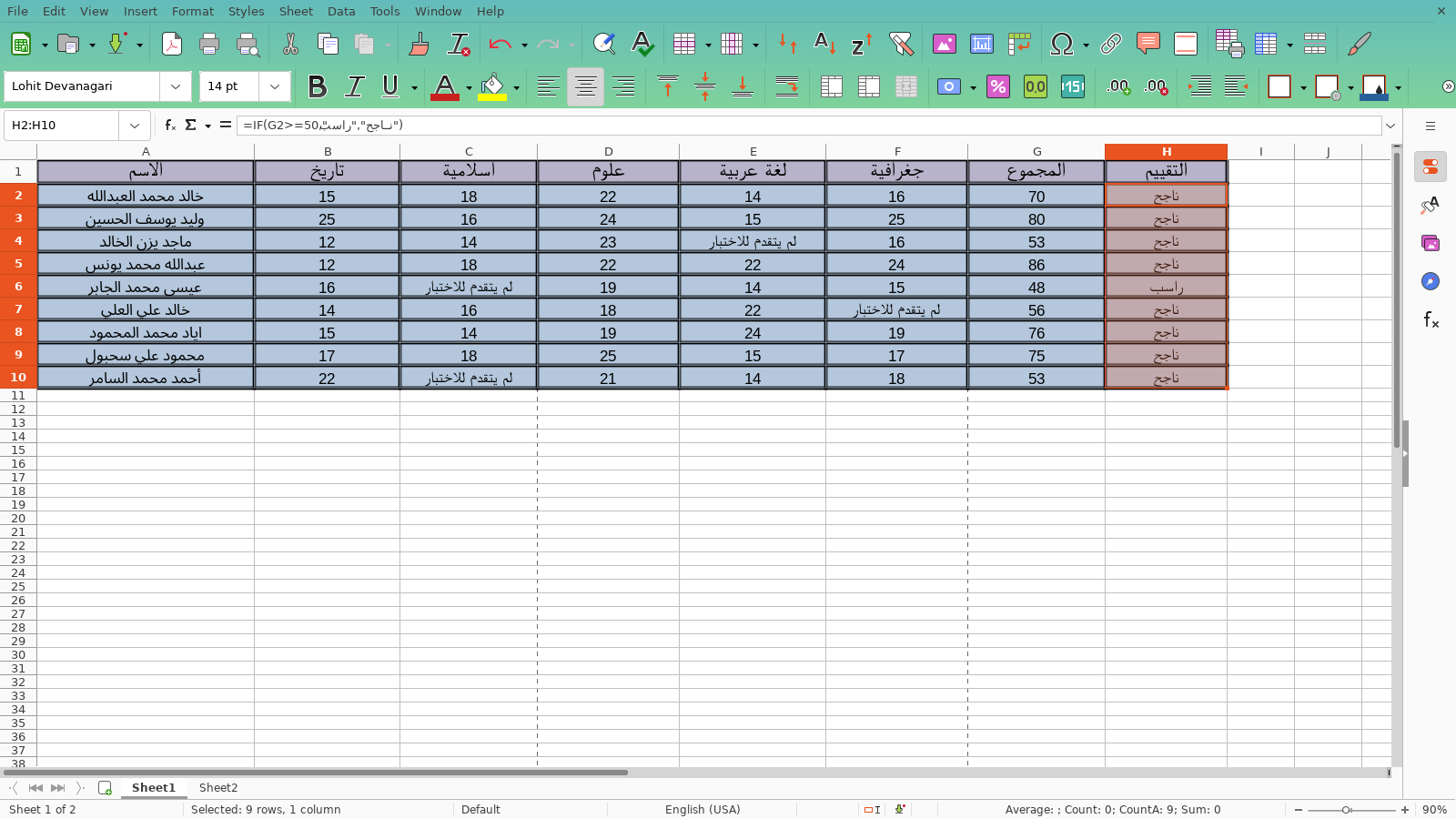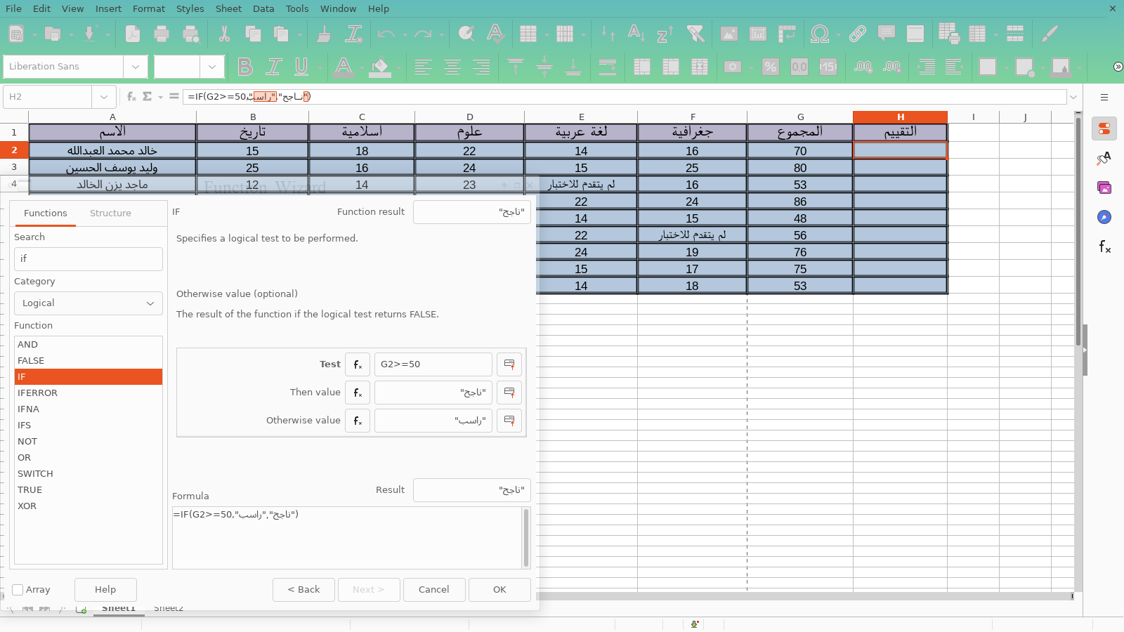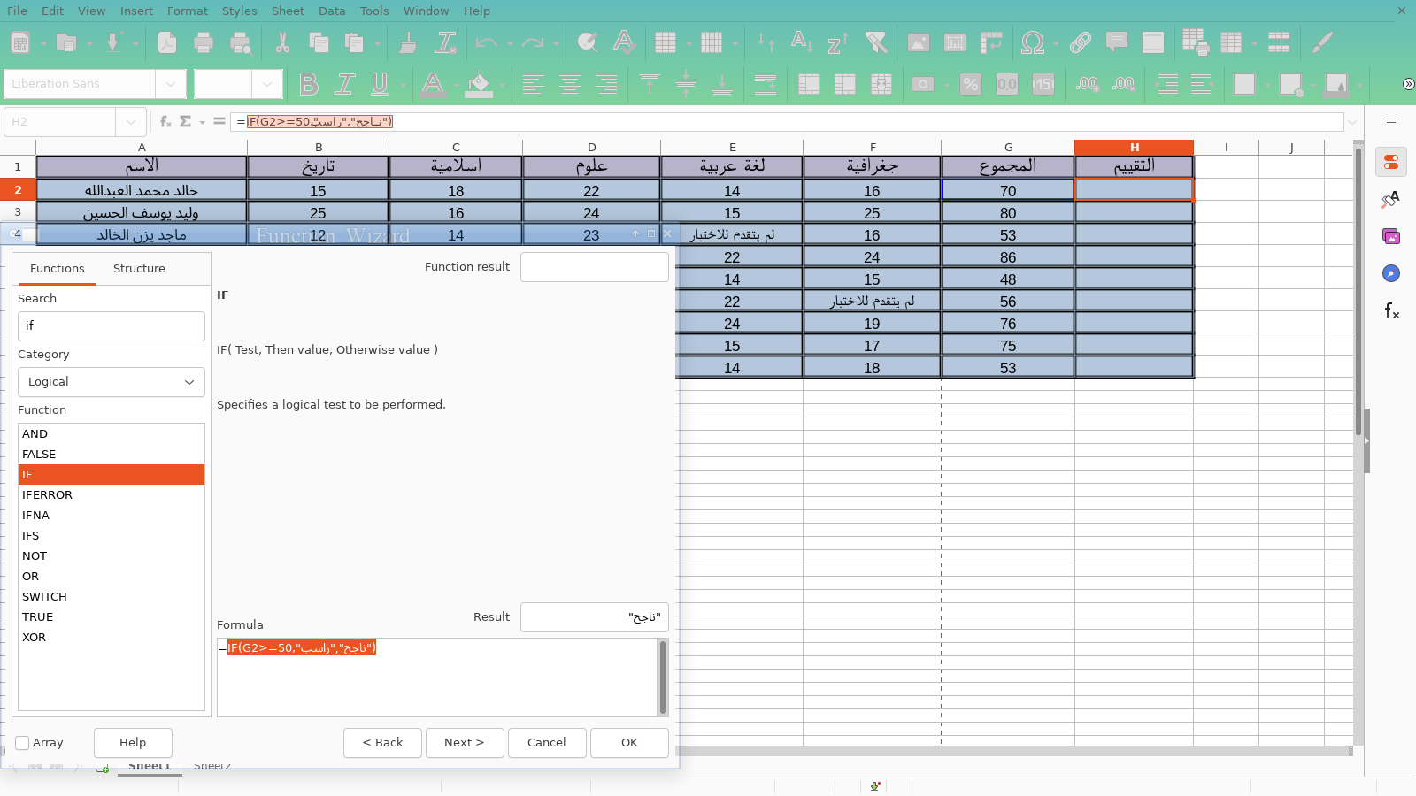 والشرط سيكون اذا خلية المجموع للطالب الأول الخلية المطلوبة أكبر أو تساوي 50