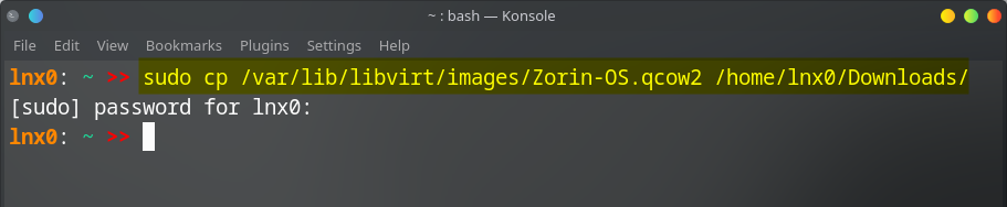sudo cp /var/lib/libvirt/images/Zorin-OS.qcow2 /home/lnx0/Downloads/Zorin-OS