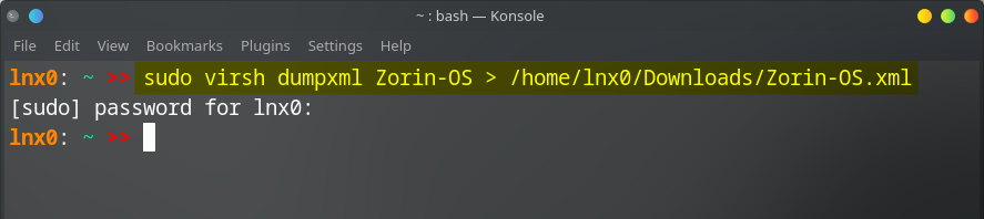 sudo virsh dumpxml Zorin-OS > /home/lnx0/Downloads/Zorin-OS.xml