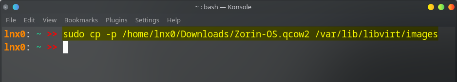 sudo cp /home/lnx0/Downloads/Zorin-OS.qcow2 /var/lib/libvirt/images