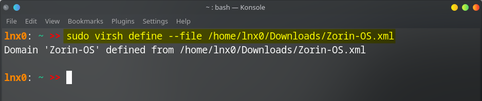 sudo virsh define --file /home/lnx0/Downloads/Zorin-OS.xml