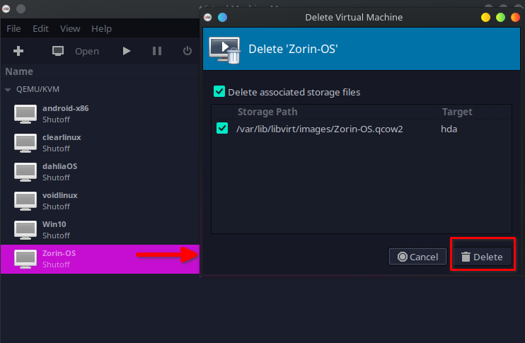للتأكد من أن استعادة النسخة الاحتياطية ستكون ناجحة، قمت بحذف صورة القرص باستخدام Virt-manager وهي واجهة رسومية لإدارة الآلات الافتراضية كما هو موضح.