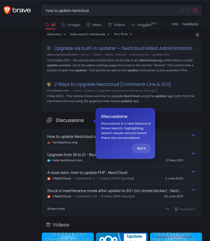 Brave لديه مِيزة Discussions التي تظهر اي موقع نقاش حول مشكلة او مقارنة تبحث عنها: