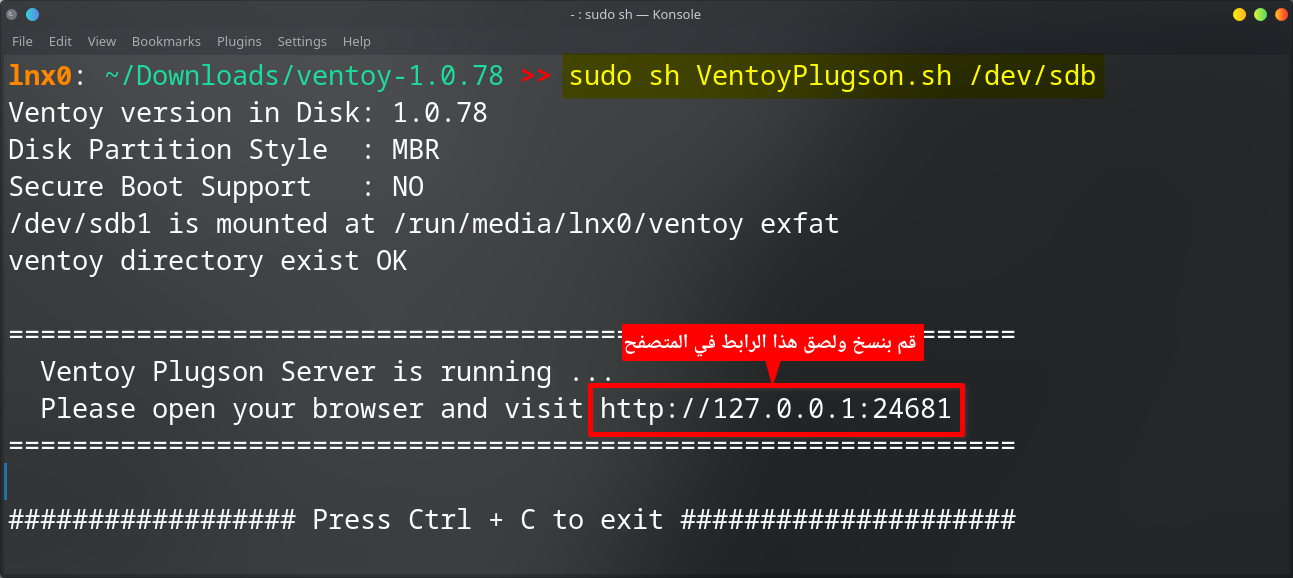 الآن من نفس مجلد ventoy (الخطوة رقم 1 سابقا) ستقوم بتشغيل VentoyPlugson عن طريق الأمر التالي.