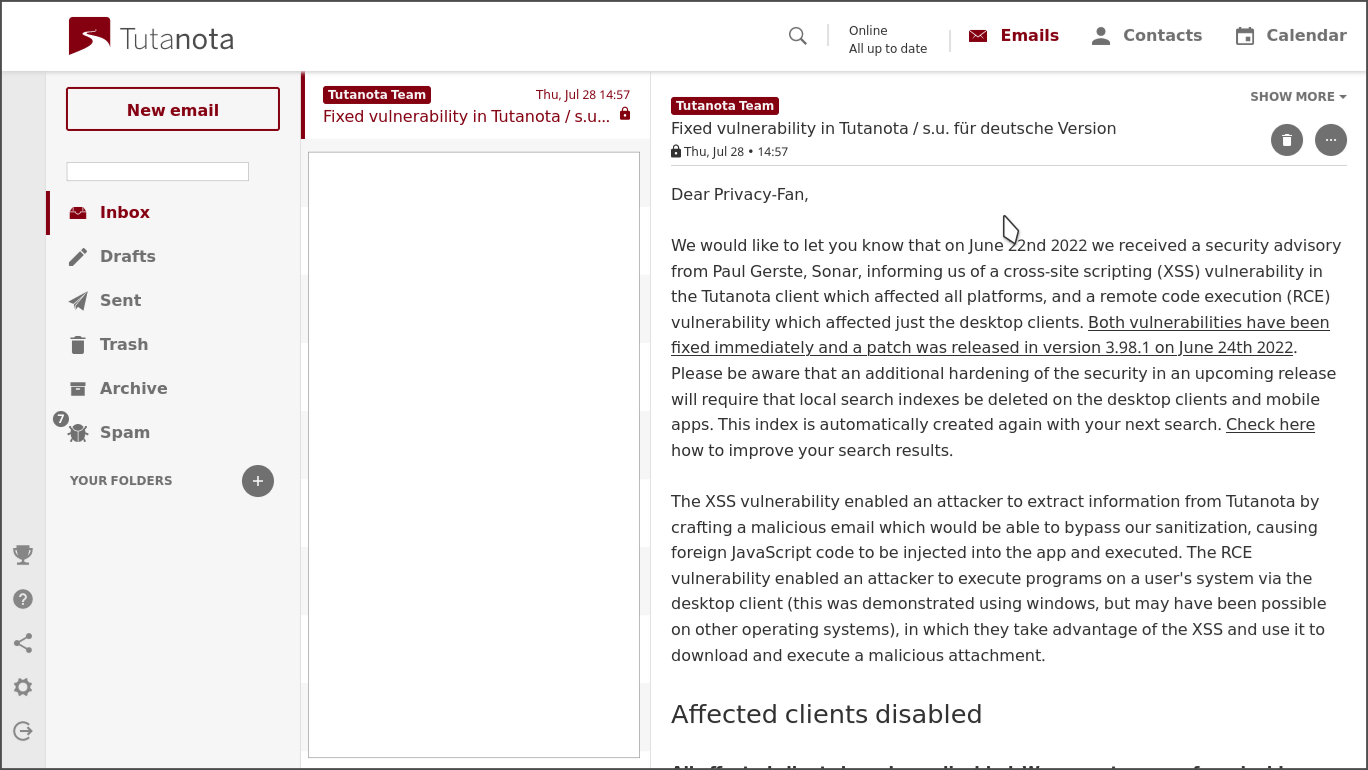 بالنسبة لتوتانوتا، فالأمر مختلف: بريدك مشفر، حتى تستطيع البحث في محتواه يجب أن تتم عملية فك تشفيره محليا على جهازك، ثم تتم بعدها عملية البحث. بهذه الطريقة تكون الخدمة قد حافظت على ميزة البحث المهمة مع احترام خصوصية المستخدمين.