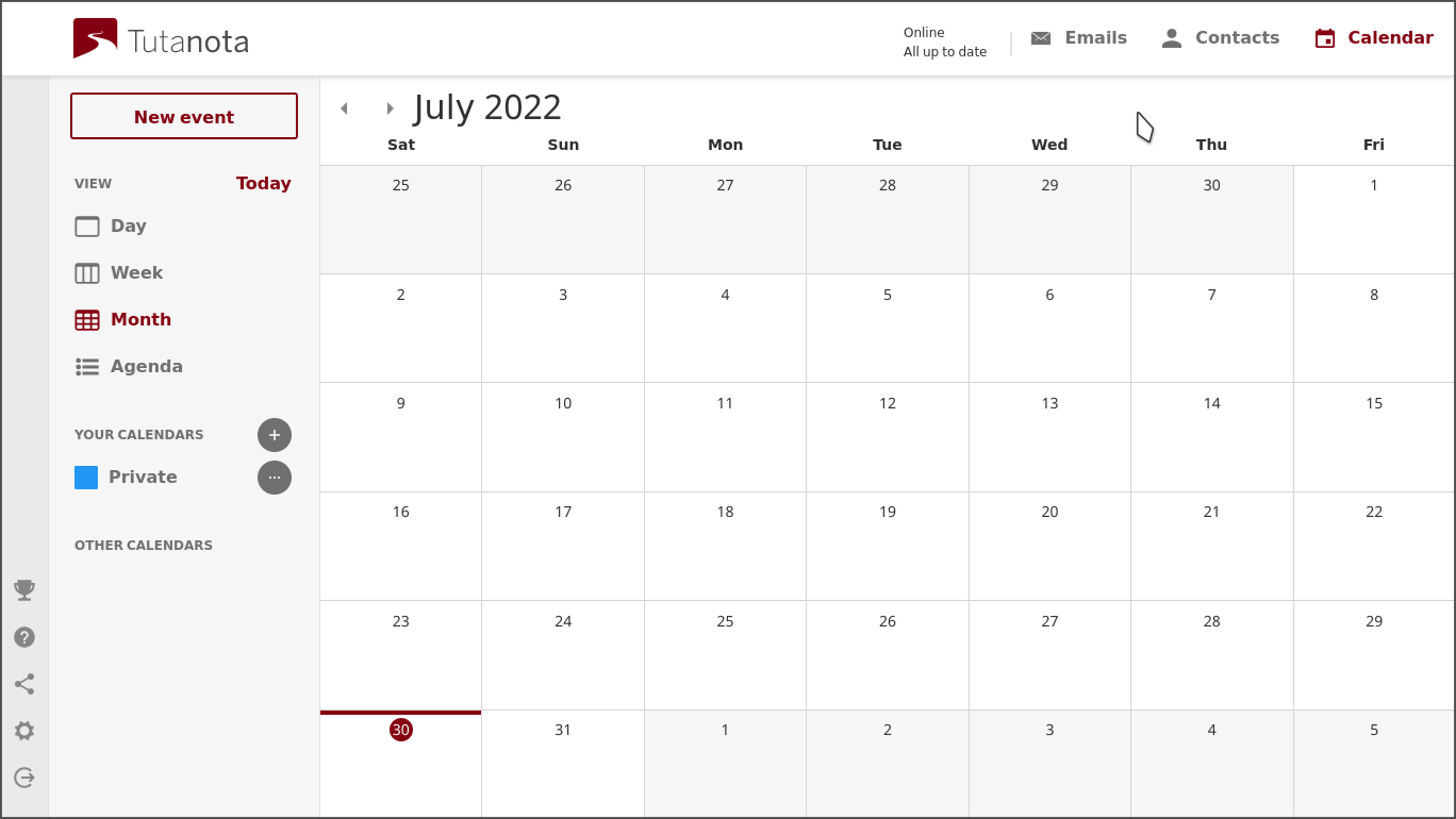يُعدُّ التقويم -بسبب وظيفته، نوع، حساسية ودقة المعلومات الموجودة عليه- من أكثر الميزات التي يجب تأمين خصوصيتها. بسبب ذلك توفر خدمة توتانوتا تقويما مشفرا ومدمجا في بريدها الإلكتروني. صحيح أن هذا التقويم يعتمد على السحابة لكن فك تشفيره يتم محليا على جهاز المستخدم. ما يزيد في عملية تقويم الخدمة هو إمكانية استيراد بيانات التقويم من بريد أو خدمة أخرى باستخدام الصيغ المعروفة.
