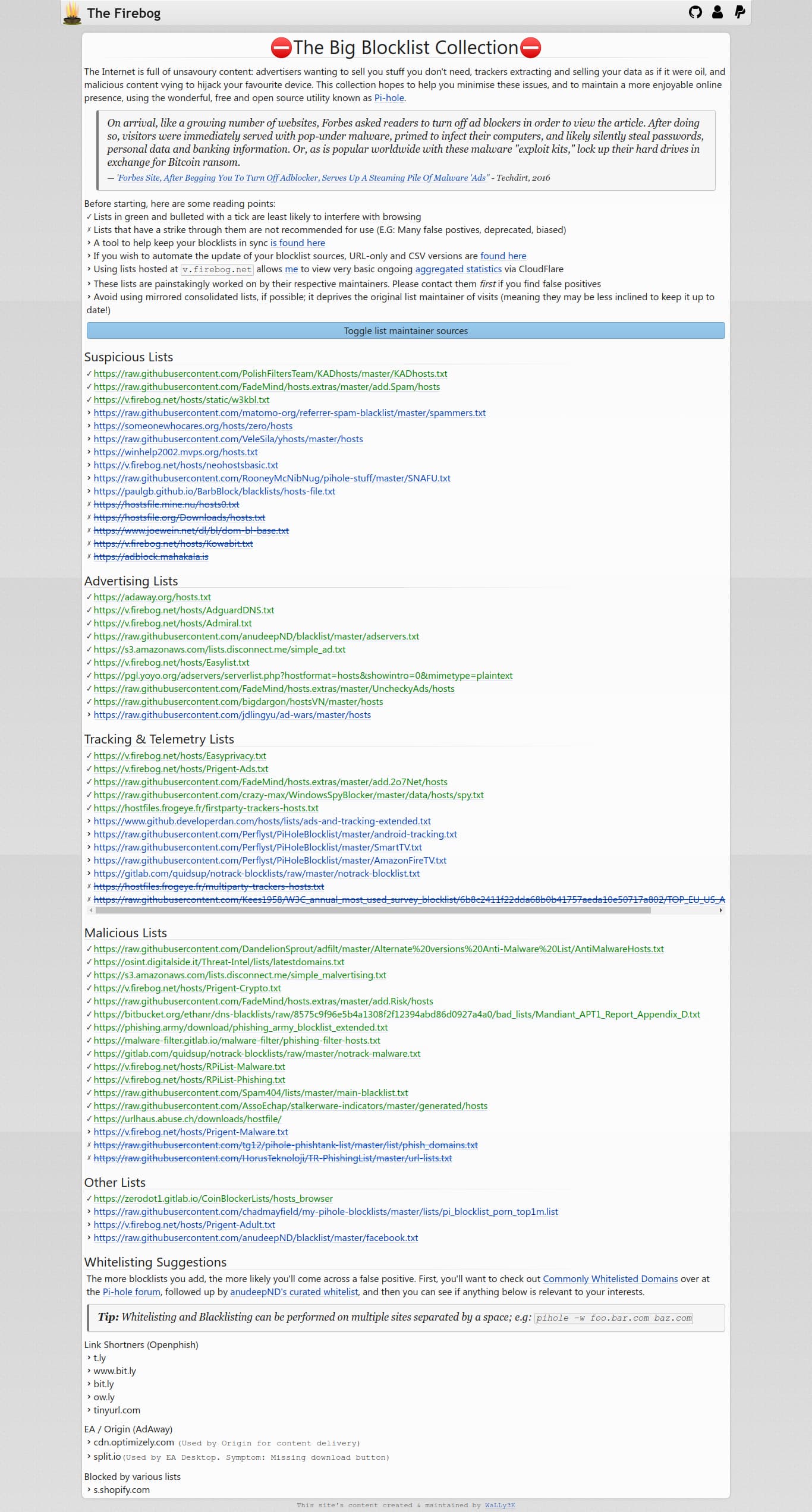 بعد ذلك سنحتاج firebog هذا الموقع الذي به قواعد الملايين من المواقع المجهزة للحجب مقسمة حسب المجال