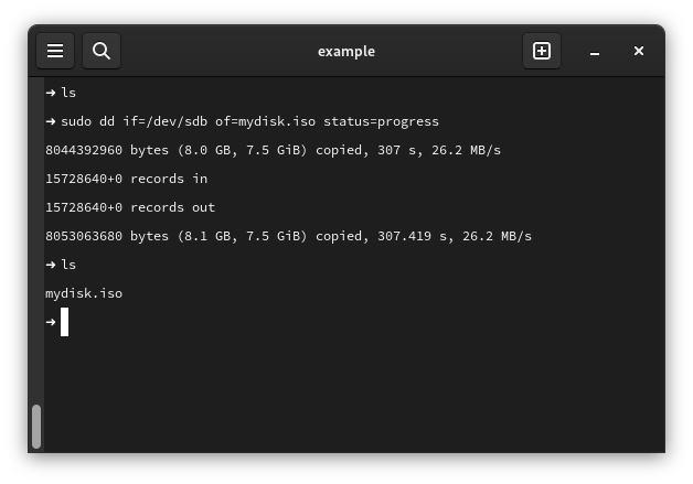 sudo dd if=<path of device> of=<path of iso > status=progress